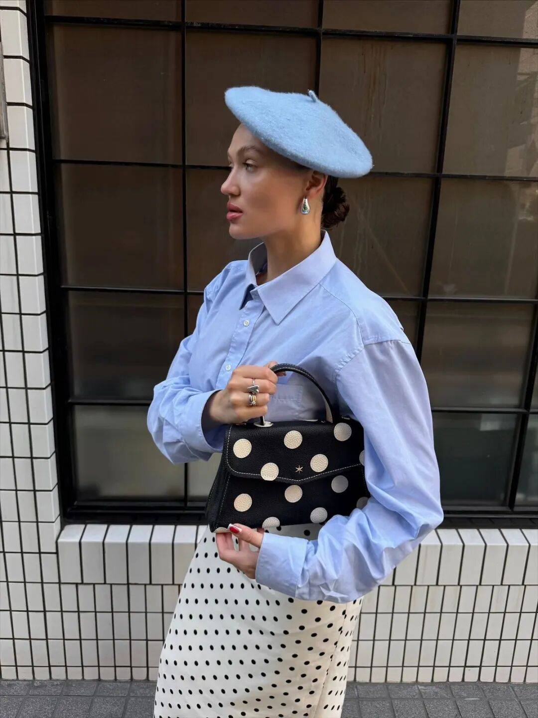 配饰上的细节让波点搭配更灵活。