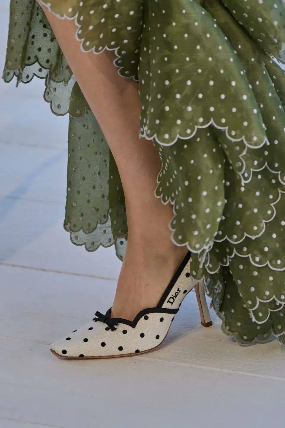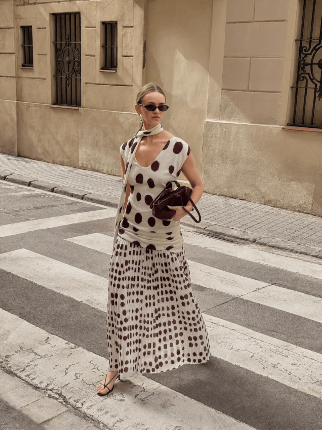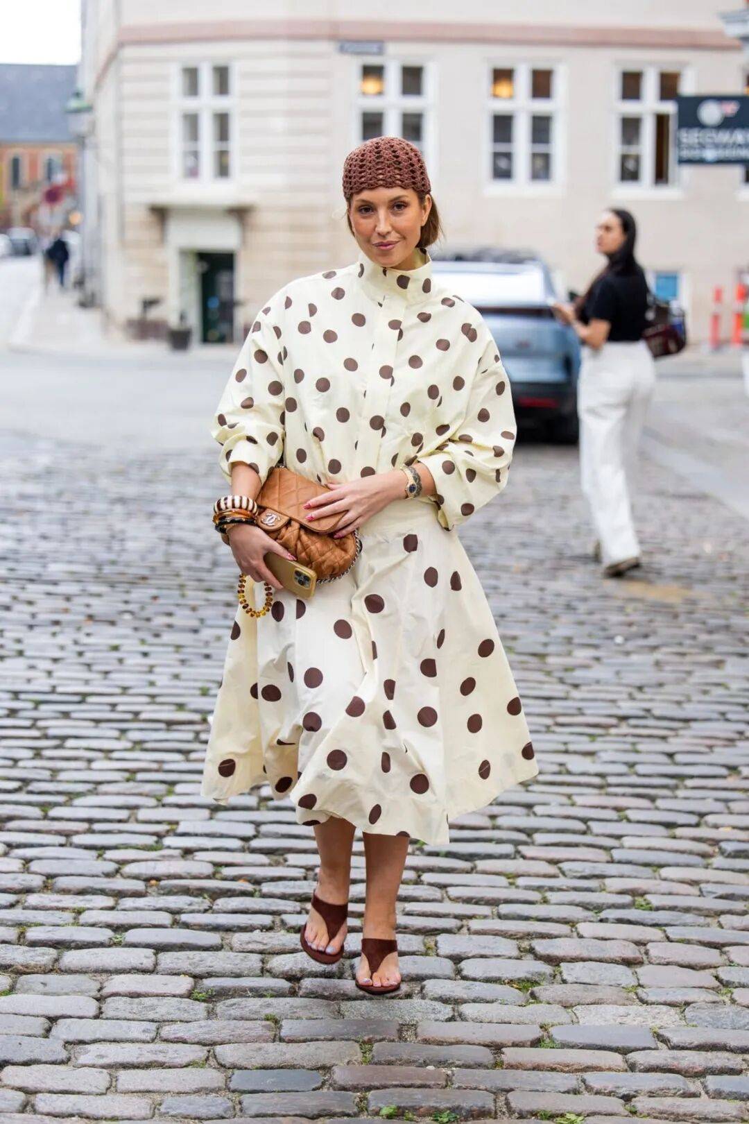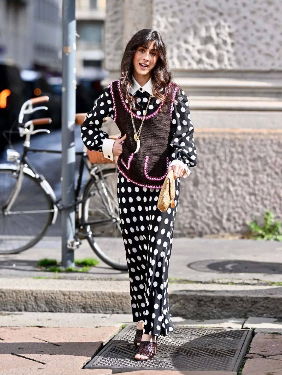 包包和鞋子上同样能见到波点的身影,为整体造型增添恰到好处的趣味。