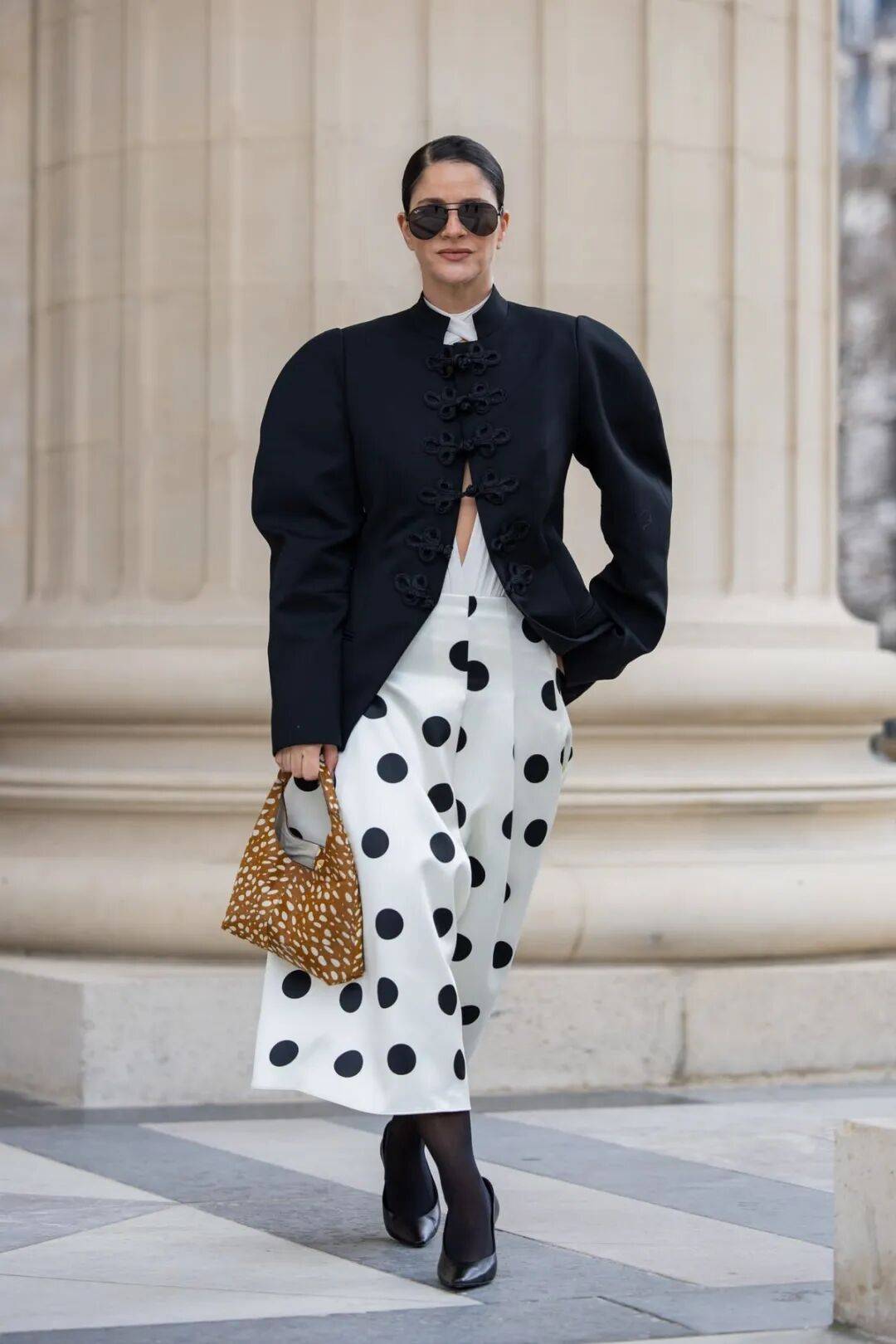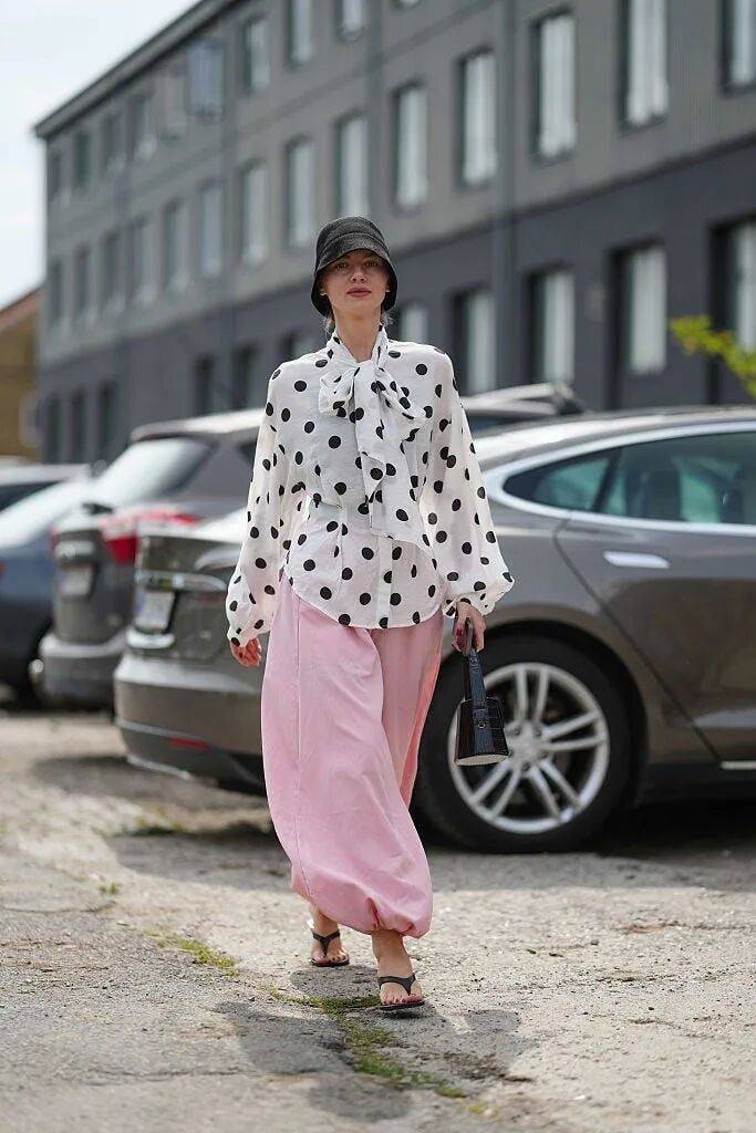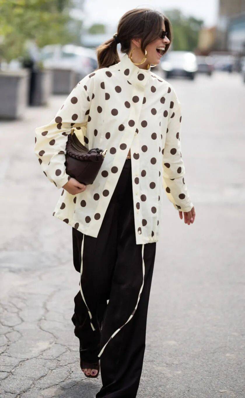 运动感夹克上可以出现波点,阔腿裤上的波点也可以很大胆,可爱的圆点让走动时的轮廓更加生动。