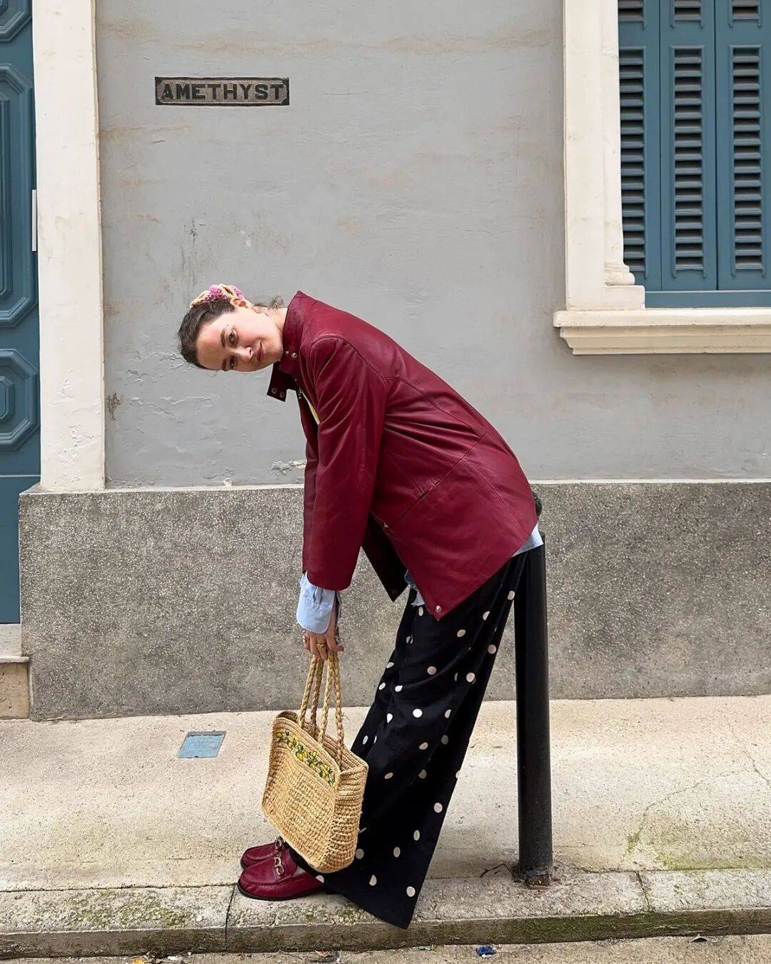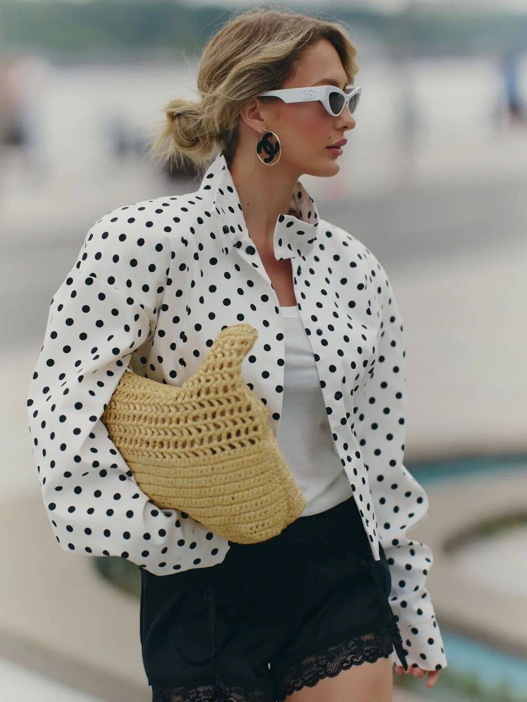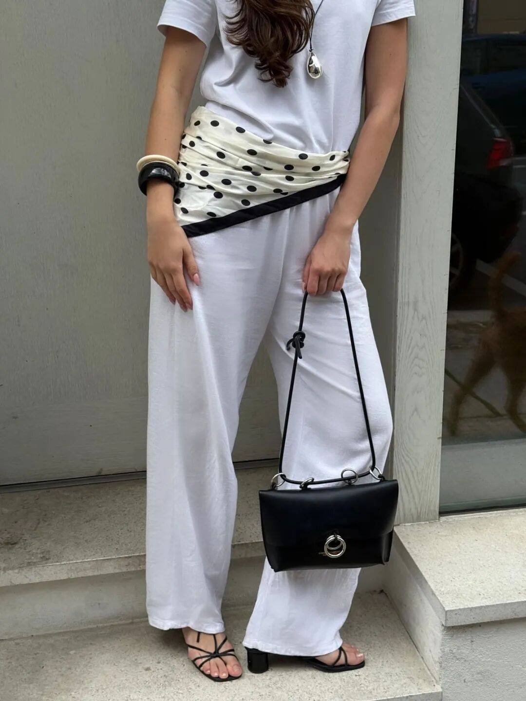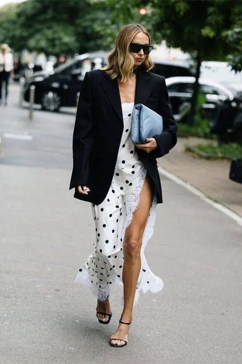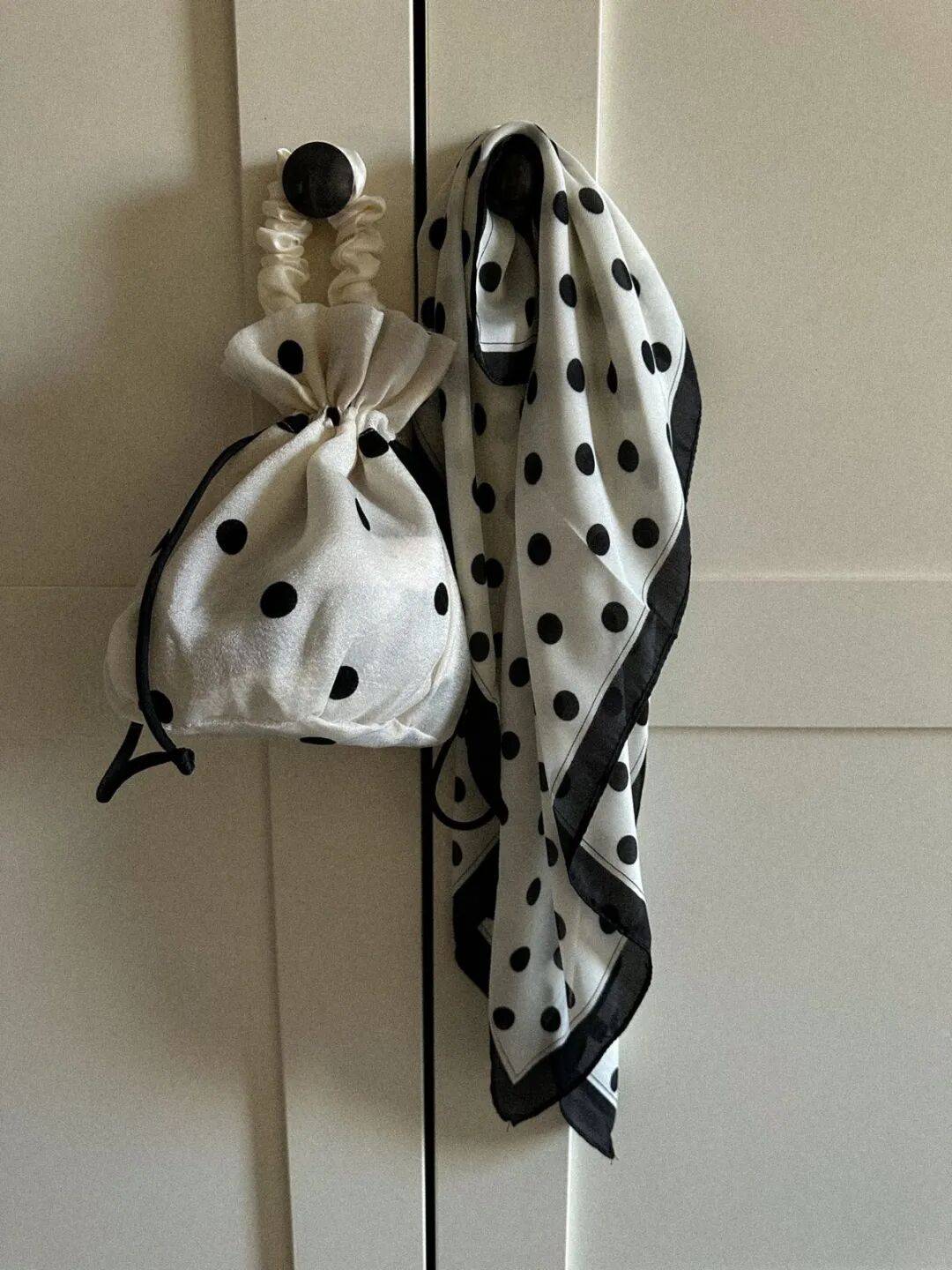总之,配饰上的波点不用多,一两处就足够了。丝巾用了波点,包包就选纯色。鞋子有波点,其他单品就就简洁一些。这样既有趣味,又不显得杂乱。