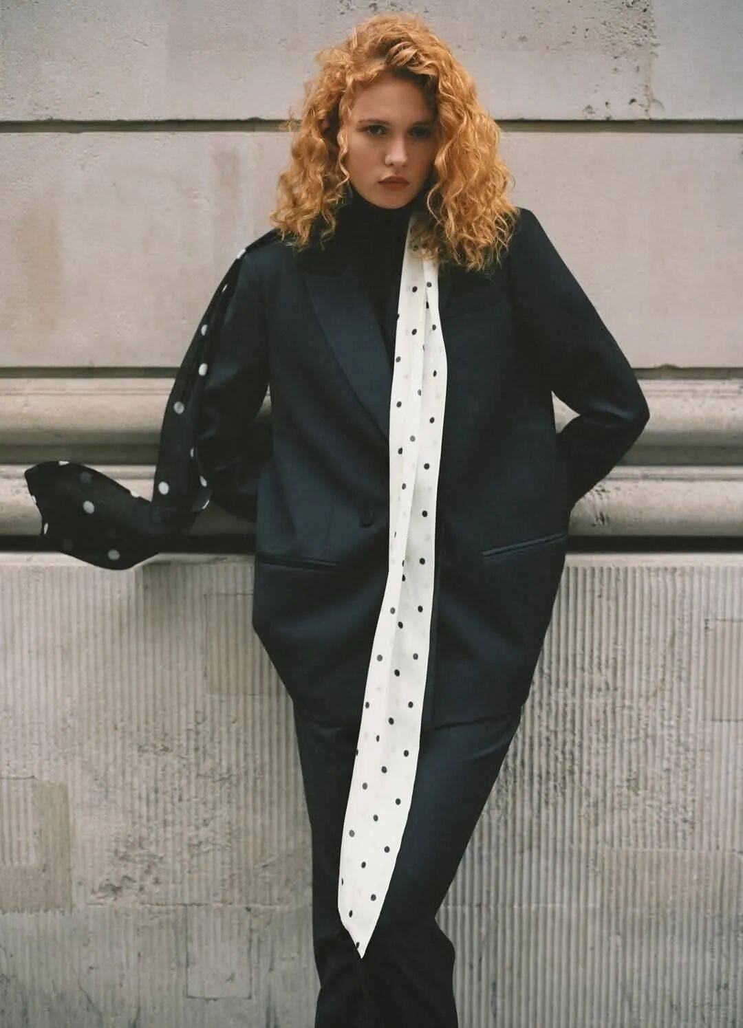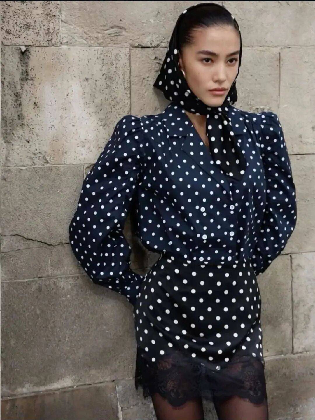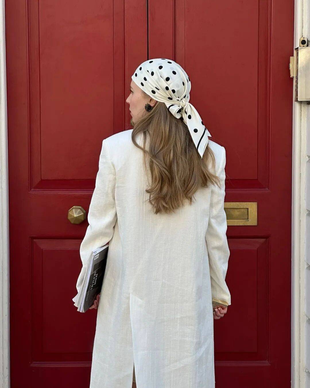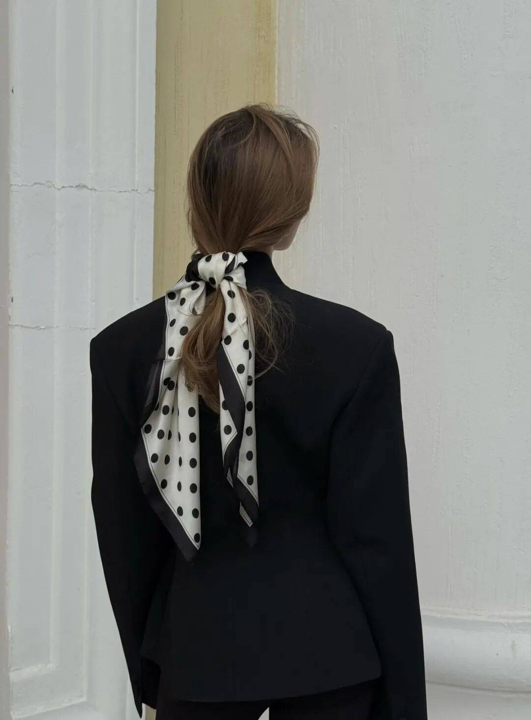 丝巾是最游刃有余的,一条小波点丝巾当发带,绑在低马尾上,转头时丝巾飘动,波点跟着跳跃。