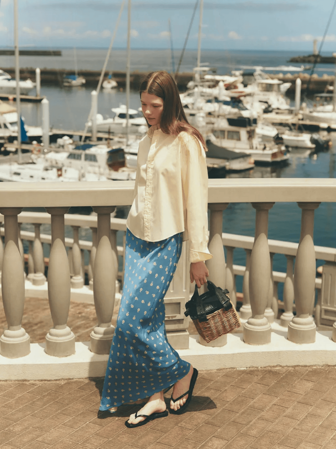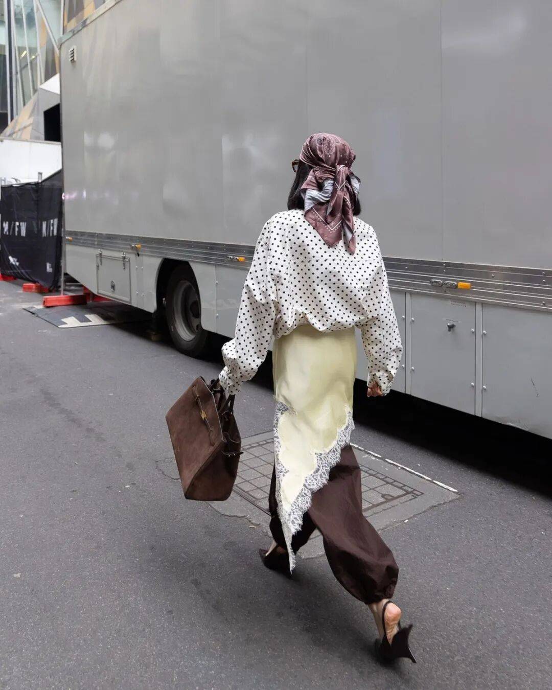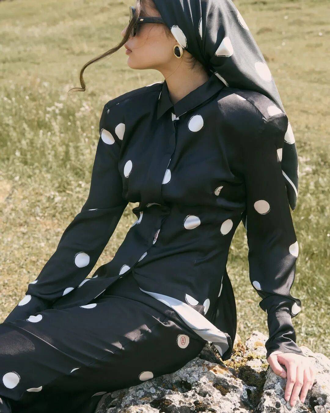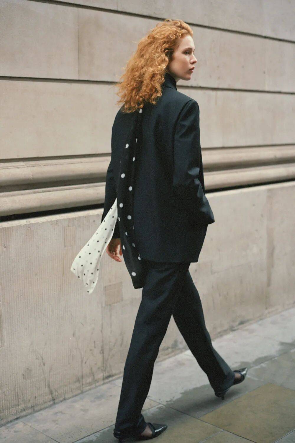 丝巾是最游刃有余的,一条小波点丝巾当发带,绑在低马尾上,转头时丝巾飘动,波点跟着跳跃。