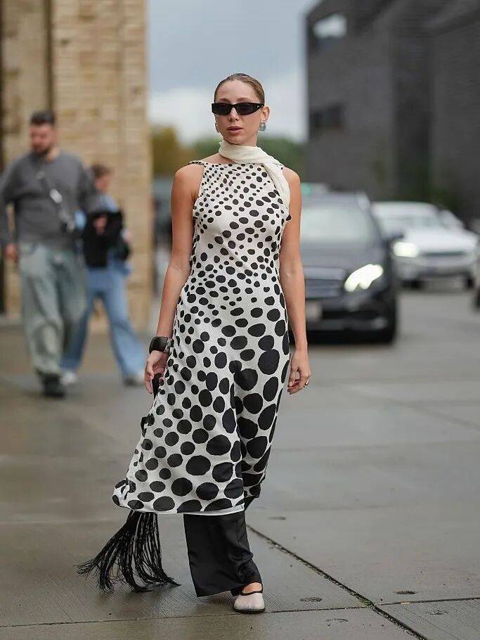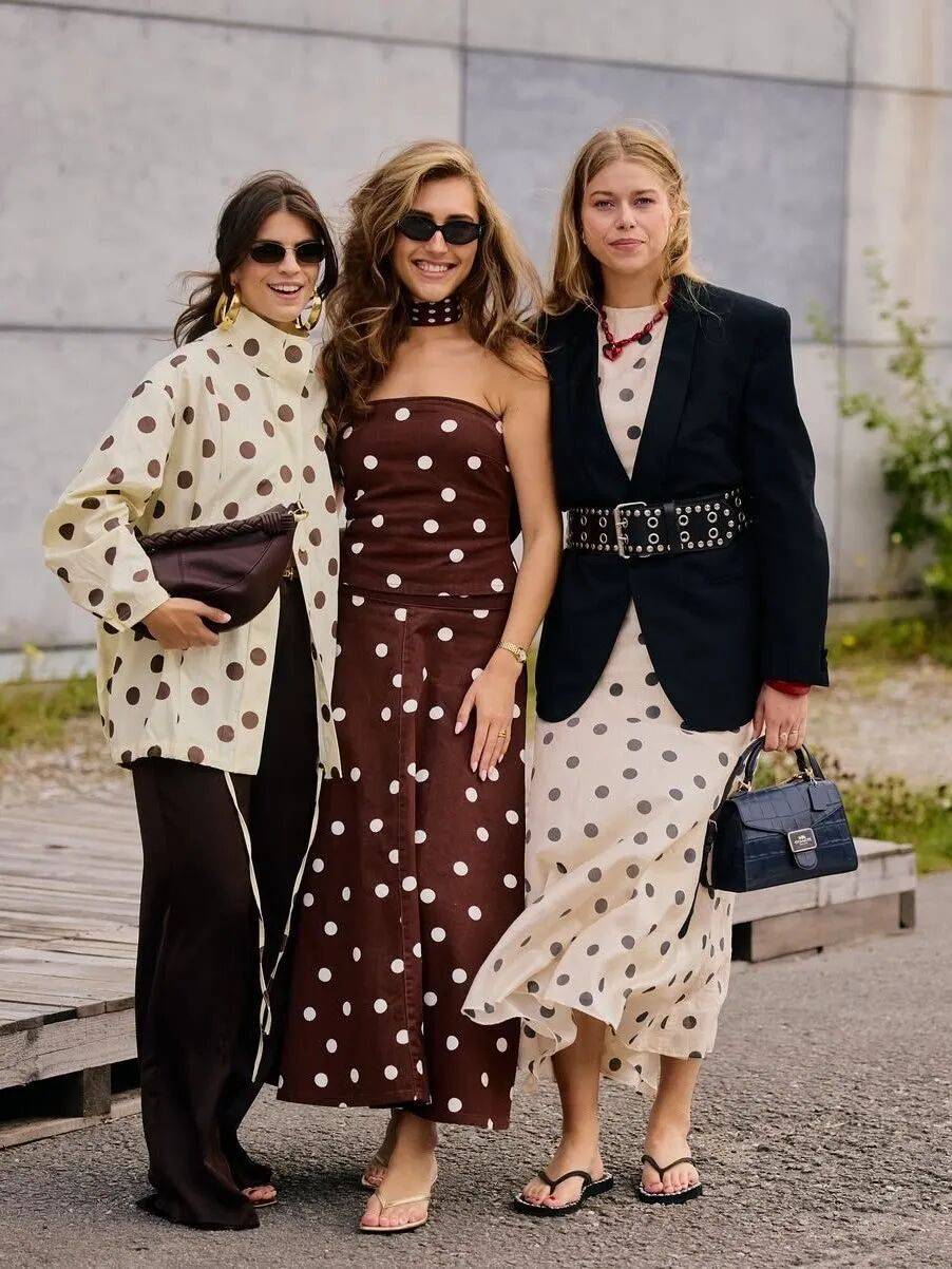 波点的大小和密度也更为灵动。过去均匀排布的大圆点依然经典,但今年更流行错落有致的细密波点,打破秩序之后更为灵动。