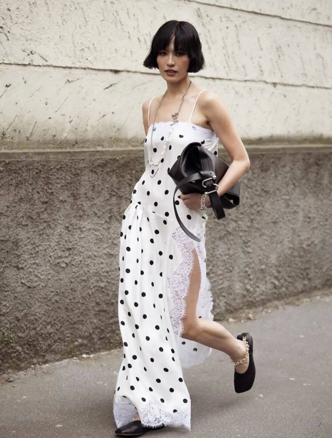 这样的设计尤其适合春夏的长裙,蕾丝消解了波点的呆板,波点平衡了蕾丝的甜腻。