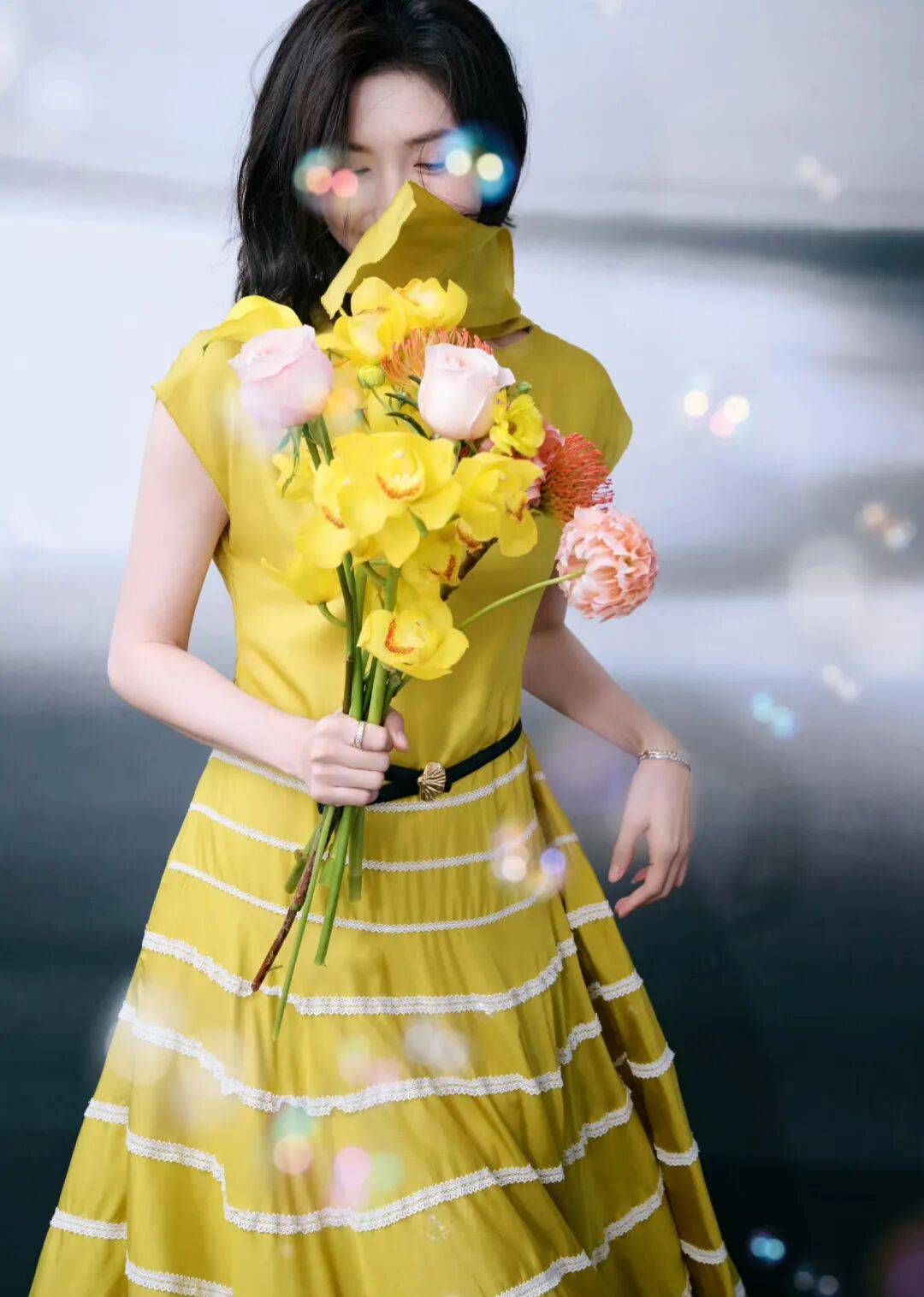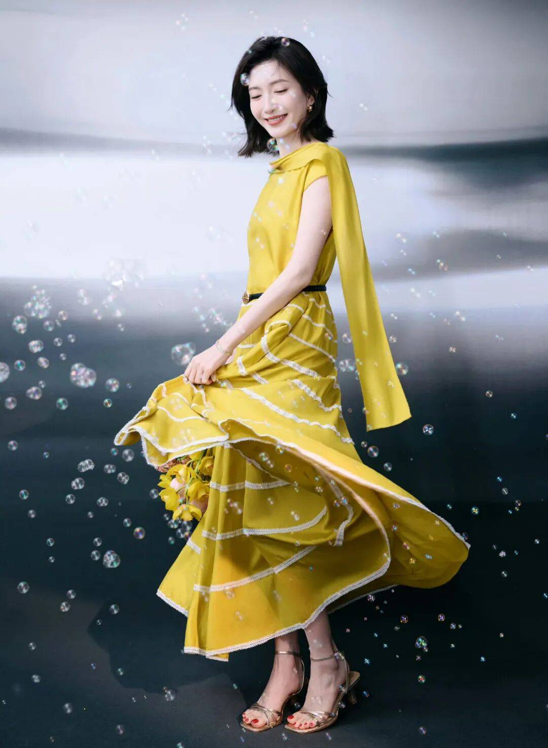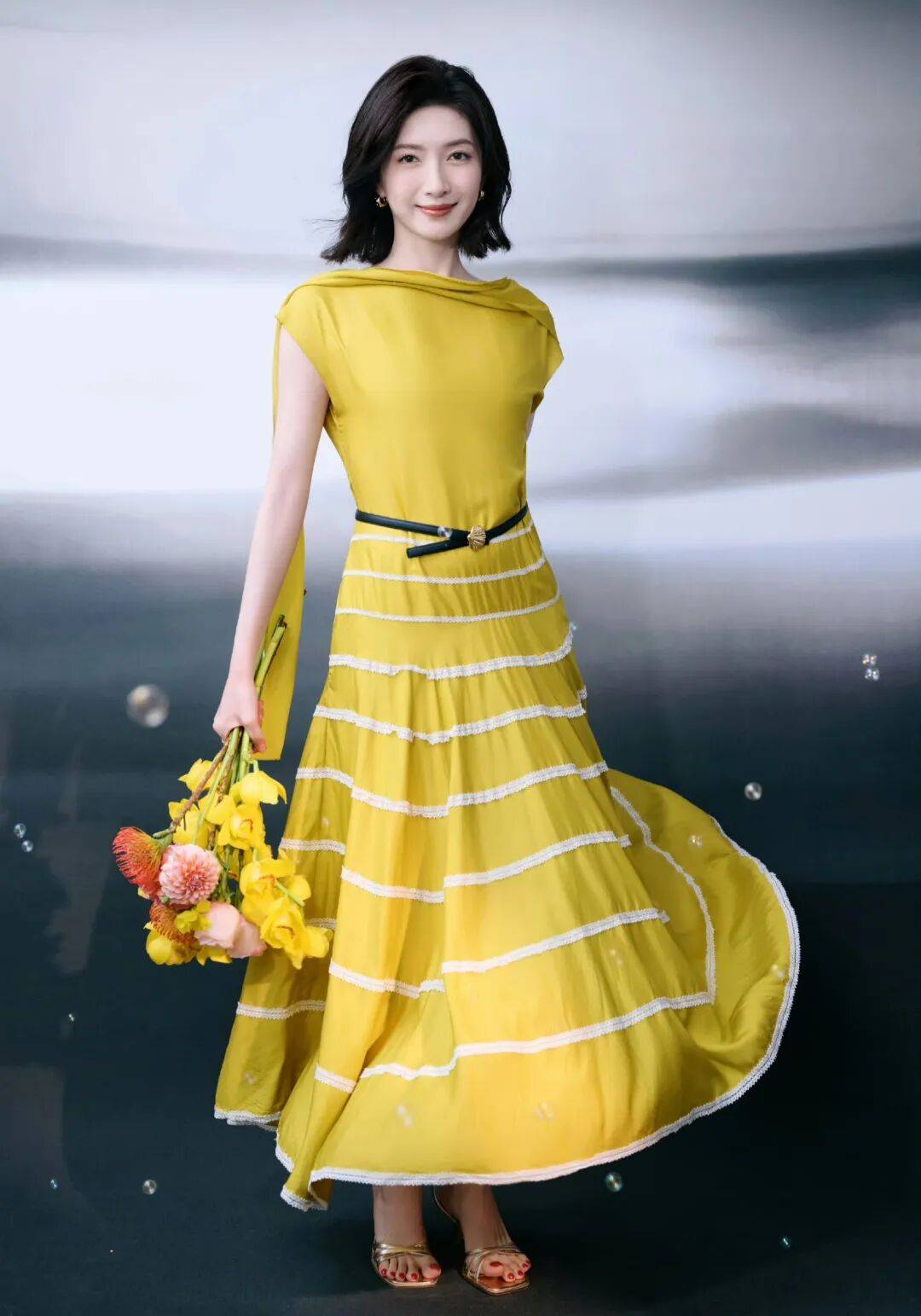 谁能拒绝一条能让人心情变好的黄色长裙呢?江疏影这身亮黄色无袖长裙,直接把春日的氛围感拉满了。