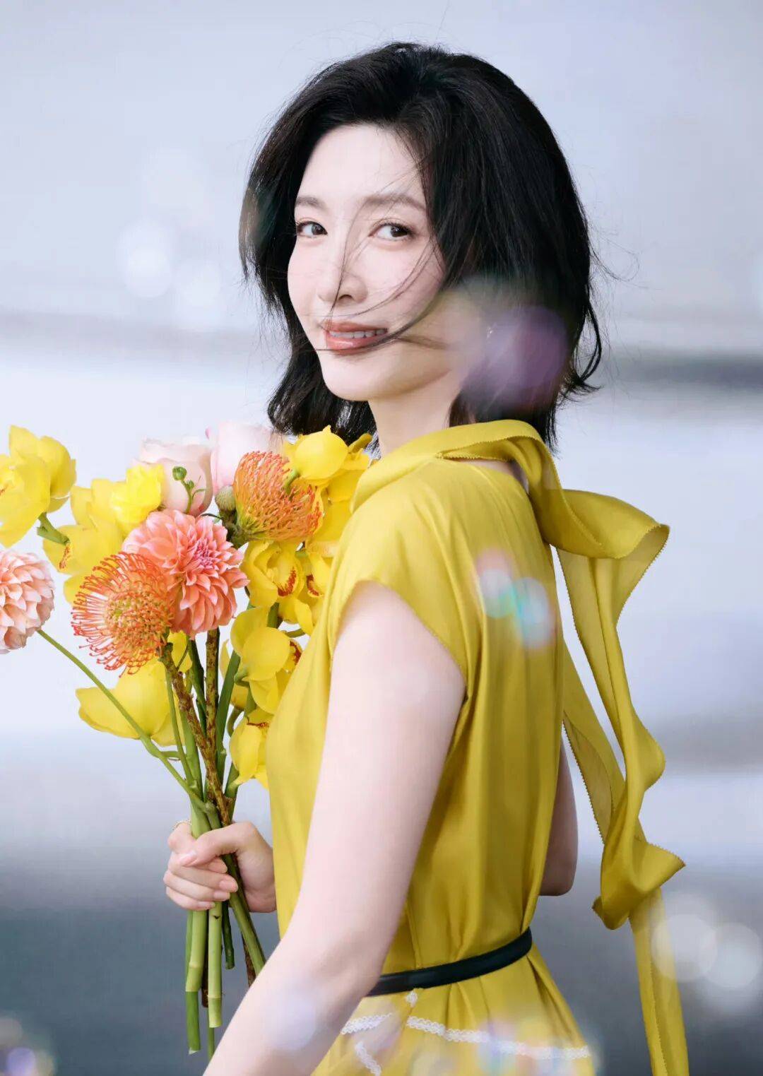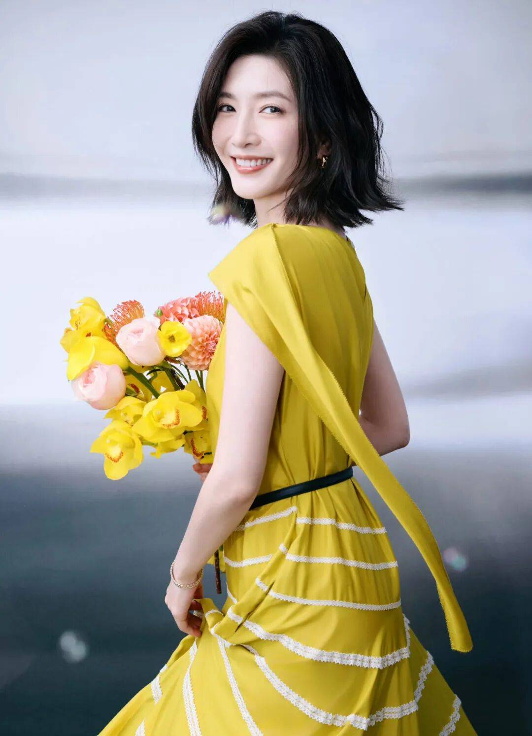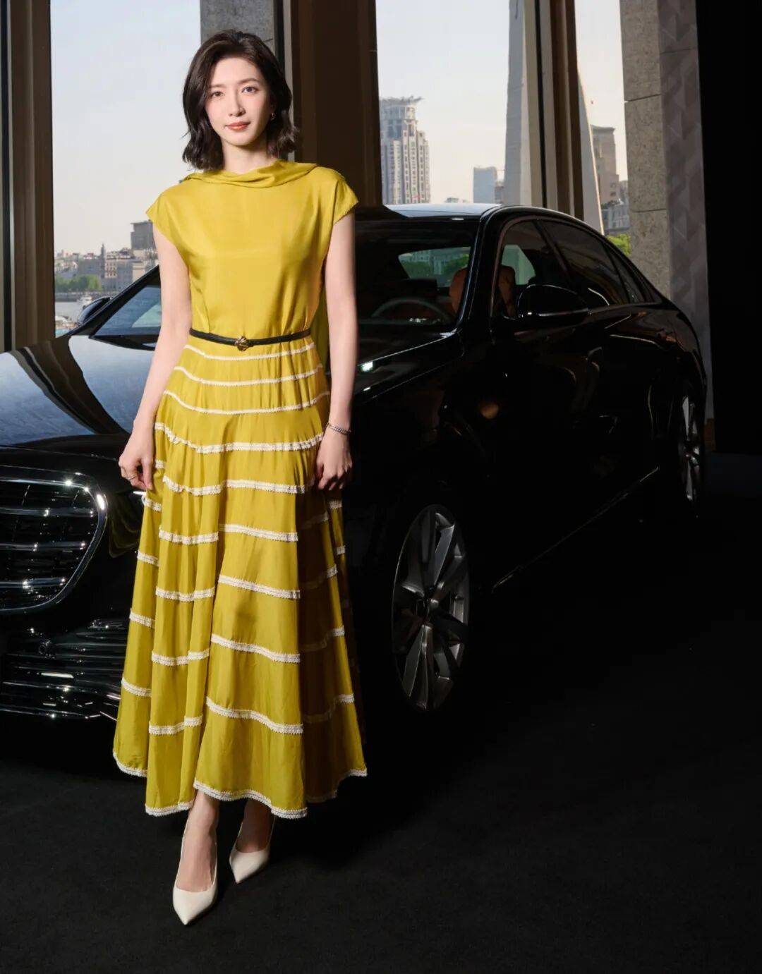 谁能拒绝一条能让人心情变好的黄色长裙呢?江疏影这身亮黄色无袖长裙,直接把春日的氛围感拉满了。