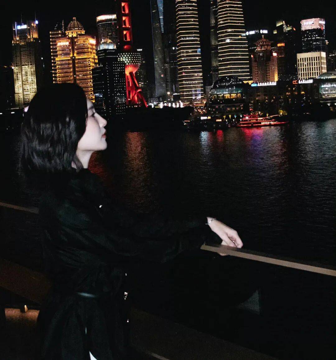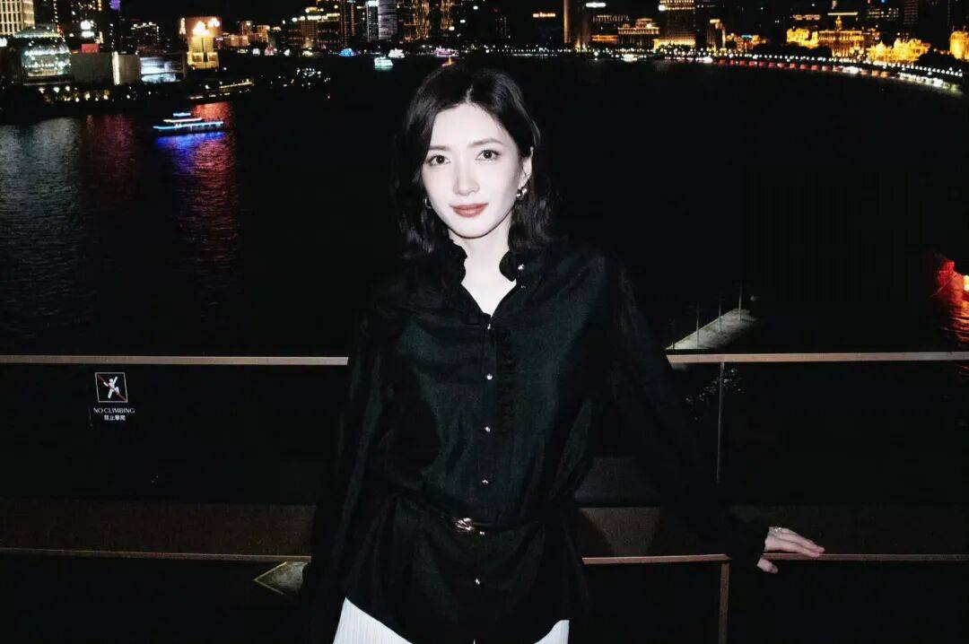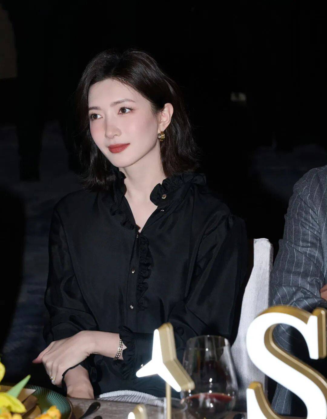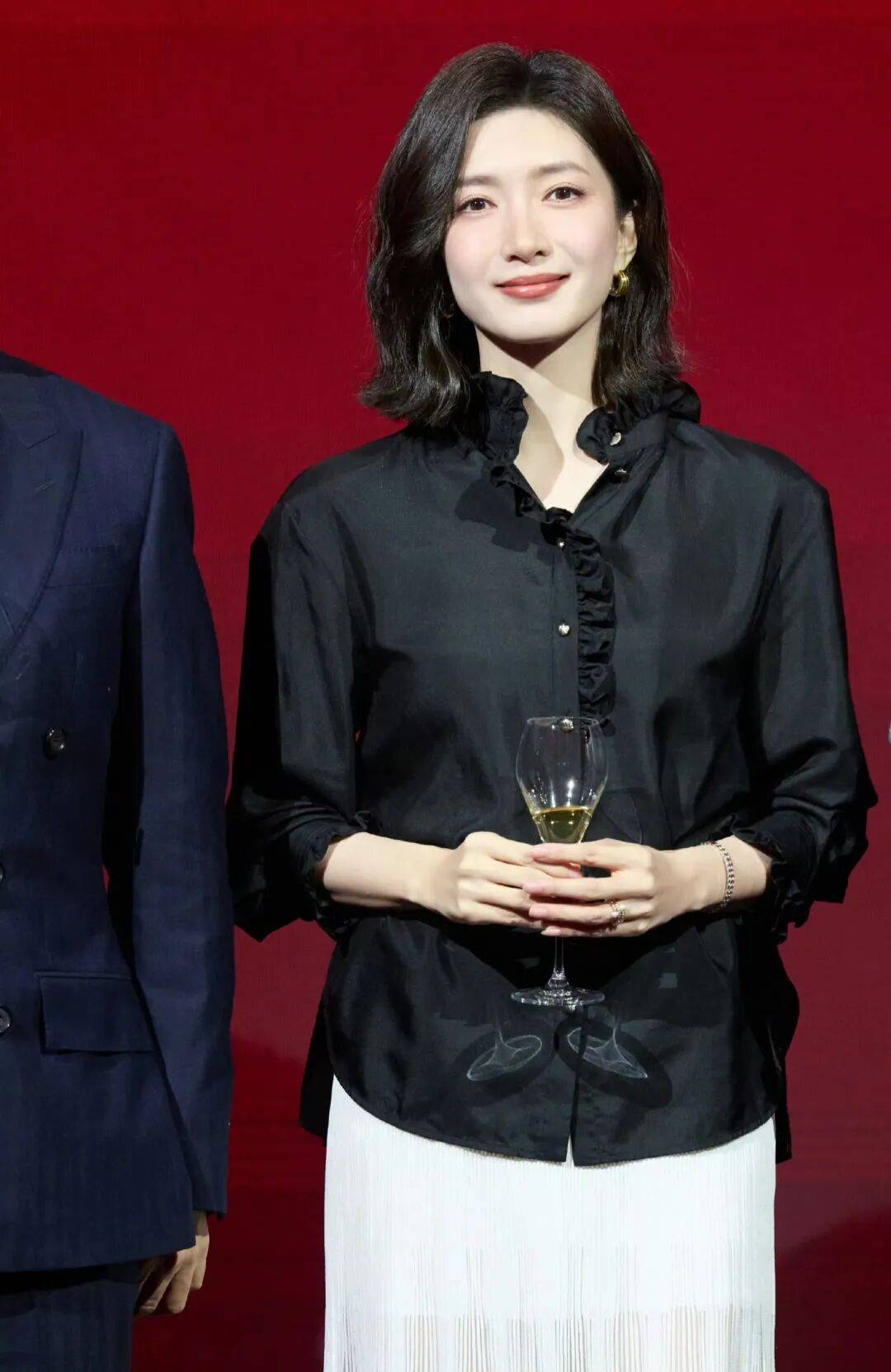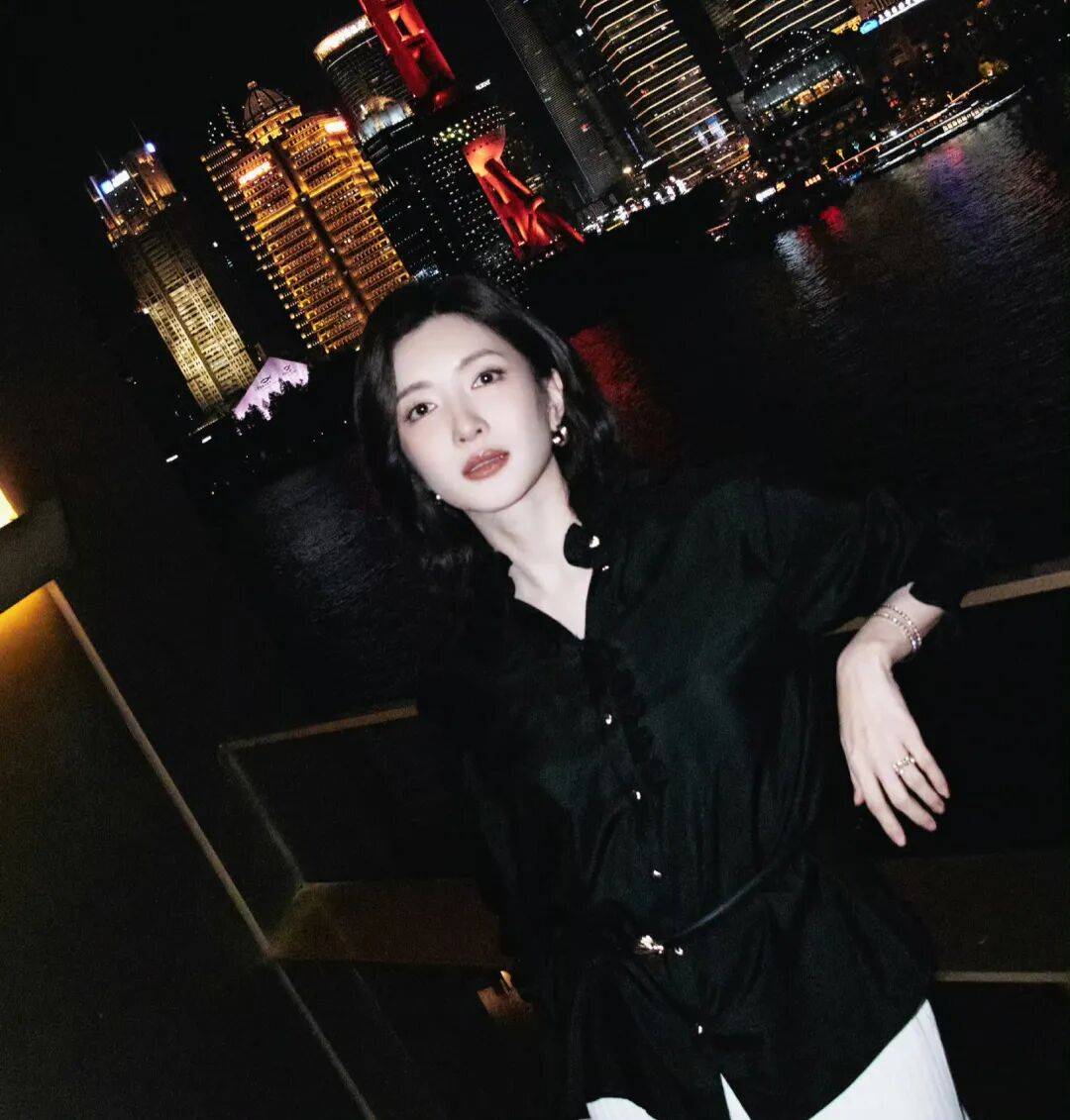 江疏影选择了一件黑色木耳边衬衫作为上衣。纯黑色衬衫很容易穿得沉闷死板,而领口和袖口的小木耳边设计,巧妙地中和了黑色的严肃感,增添了一丝女性的柔美和精致。衬衫上的金属纽扣,在细节处提升了整体的质感,让基础款也变得不普通。