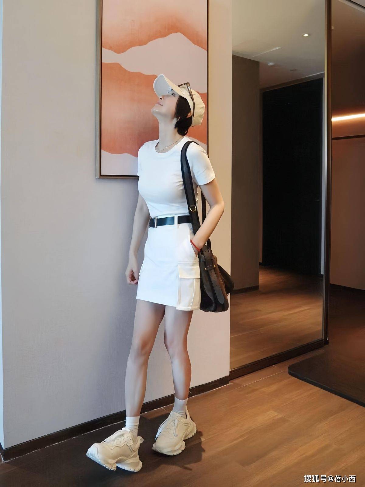 纯白色短袖不仅有圆领设计,还很修身,这样一来,可轻松勾勒身材曲线。下半身穿的是工装风短裙,裙子侧面有口袋设计,层次感拉满。腰间配了一条黑色皮质腰带,金属扣很是亮眼,一下子就收紧了腰线。厚底老爹鞋搭配白色中筒袜,自带休闲感。