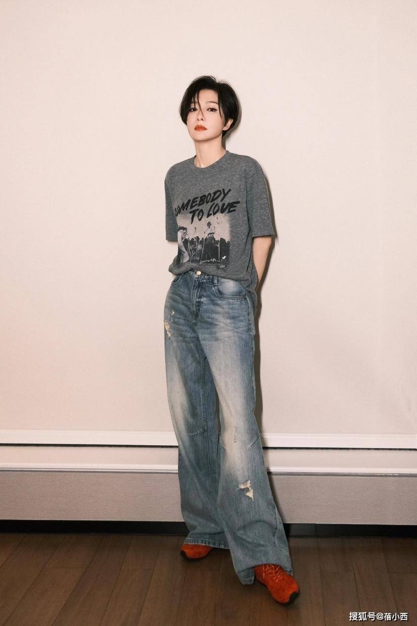 T恤面料看着很像是薄薄的针织或者棉麻材质,垂坠感蛮自然。条纹不是直的,而是斜着的,顺着衣摆往下走,显得很随性,没有那种刻板的感觉,给人松弛又不邋遢的感觉。下半身搭配的是一条纯白色高腰牛仔裤,腰头是经典的单排扣设计,扣子出现在腰最细的地方,一下子就把腰线拉高了。裤子融入了直筒设计,也带有一定松量,我们看不到什么多余的花纹,也没有什么卷边。白裤子垂下来的弧度很干净,把腿型修饰得又直又长。