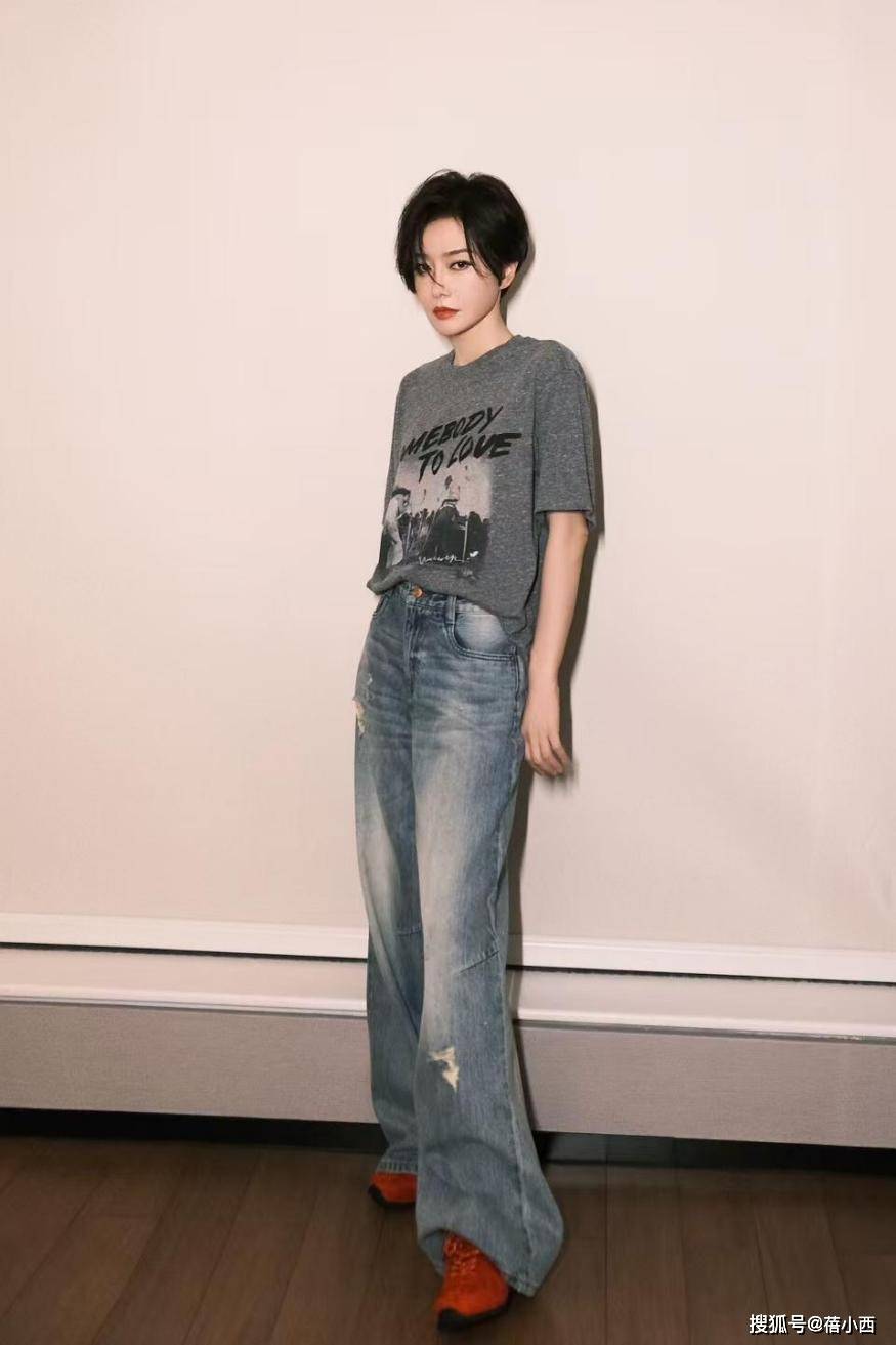 腿上穿的是浅蓝色牛仔裤,高腰设计的存在在一定程度上优化了身材比例。我们可以看到,腰头的金属扣是做旧的铜色,和整体复古的调子很搭。阔腿裤不管是什么面料,都具有一个共同点,就是隐藏肉肉和不完美的腿型。牛仔面料就算带有柔软性,它也会展现出挺阔感,撑得住版型。裤腿出现了明显的磨白处理,大腿和膝盖附近有自然的渐变褪色,还有几处不规则的破洞点缀其上,破洞边缘带着毛边,不是那种规整的剪裁,因此带着点街头的随性劲儿。