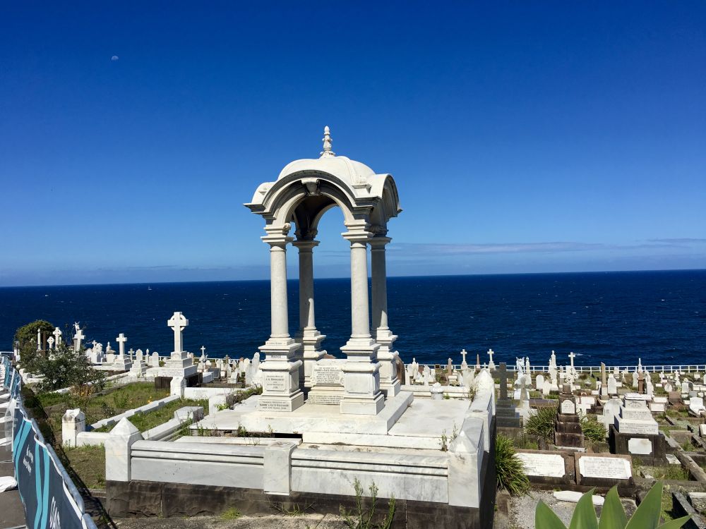 韦弗利公墓观景点是邦迪至库吉海岸步道上最引人注目的景点之一。它坐落在布朗特上方悬崖之上,与周围环境形成鲜明对比——壮丽的海景一直延伸到天际,两侧是成排的白色大理石墓碑和精美的维多利亚时代纪念碑。
