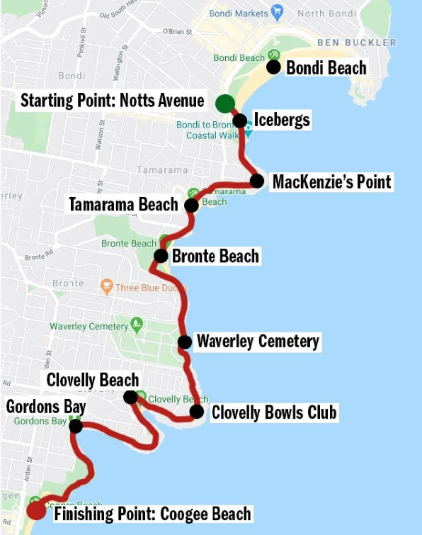邦迪至库吉海岸步道是悉尼一条风景绝美的6公里(单程)悬崖步道,通常需要2-3小时。全长大部分是木栈道,走起来很轻松,沿途风景优美。步道沿途有4个海滩和3个海湾,还有2个海水泳池。几个标志性的海滩是邦迪海滩、塔玛拉玛海滩、布朗特海滩、克洛弗利海滩和库吉海滩——沿途风光旖旎。小路沿着海岸线蜿蜒而行,沿途可以欣赏到令人叹为观止的壮丽悬崖景色,湛蓝的海水、点点风帆,每一处风景都美得令人窒息!你可以选择从库吉海滩(Coogee)走到邦迪海滩(Bondi),或者反过来走……路线是一样的!