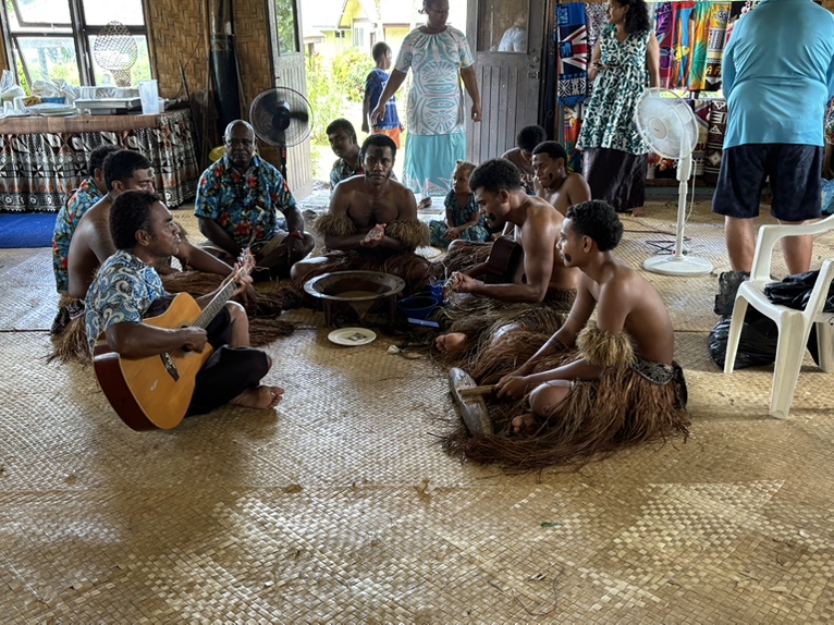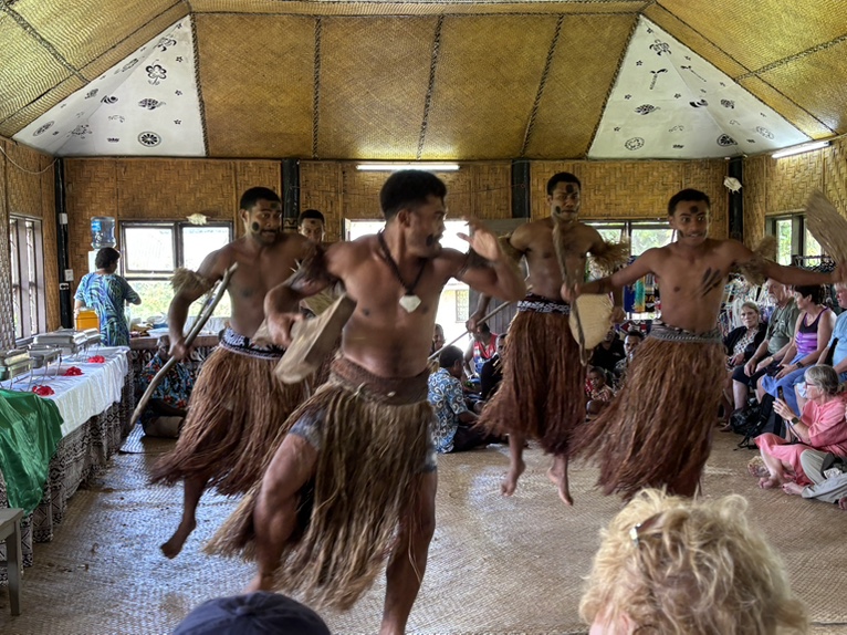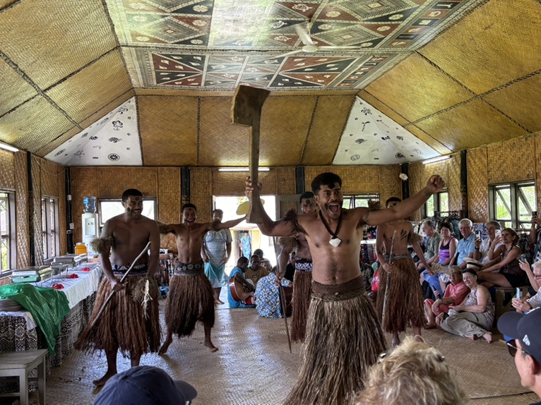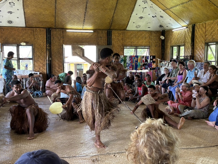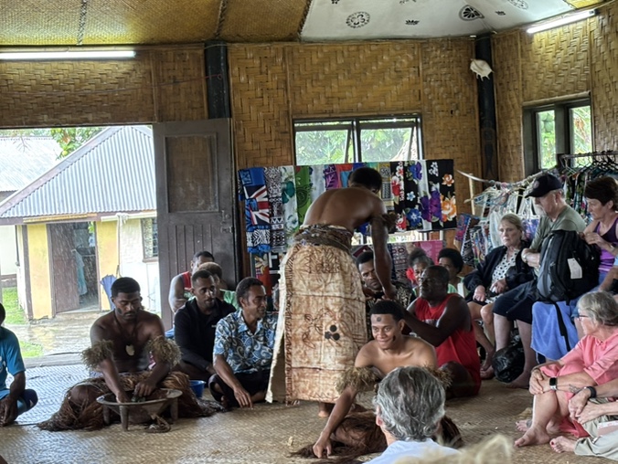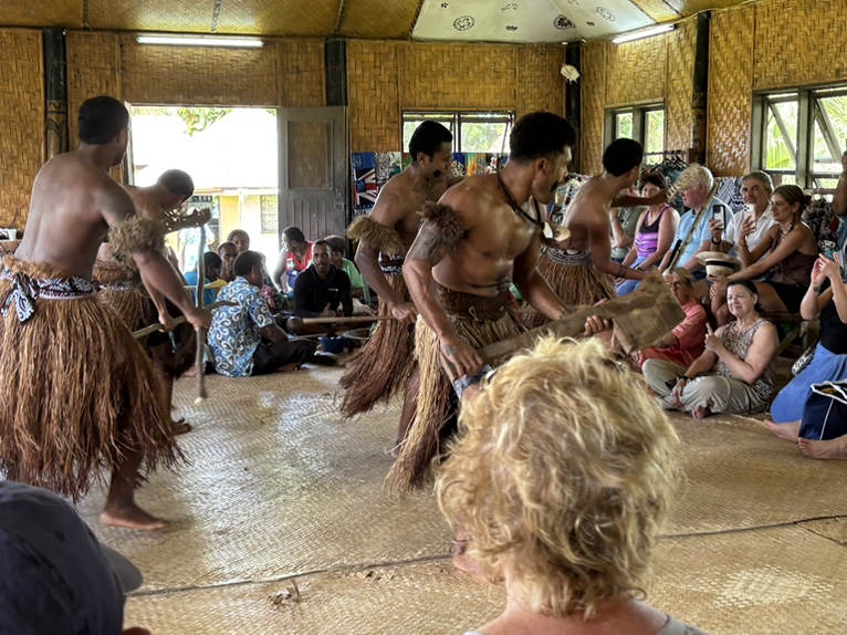 斐济的一个偏远村庄。原住民的舞蹈和欢迎仪式。游客中推出一个临时酋长,他(或她)负责喝下当地人敬给游客酋长的用手挤出的一种饮料(kava)。这种饮料有放松神经的效果。大概算是一种软性毒品。加州也有这东西。据说当地部落历史上有吃人习俗,到二十世纪才结束。