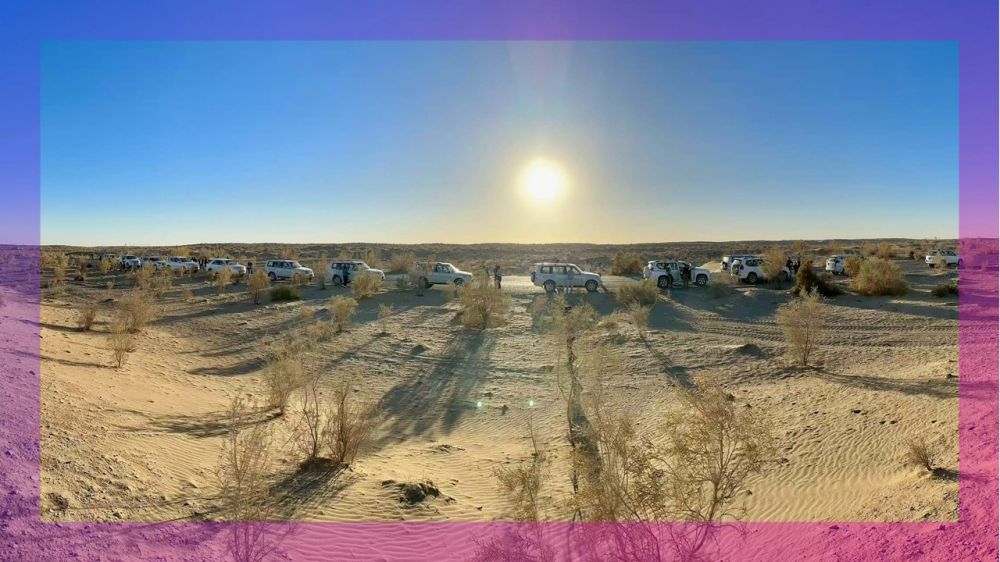 乘坐着白色越野车,我们排成一列的14辆车队,在广袤沙漠间浩浩荡荡地出发了。