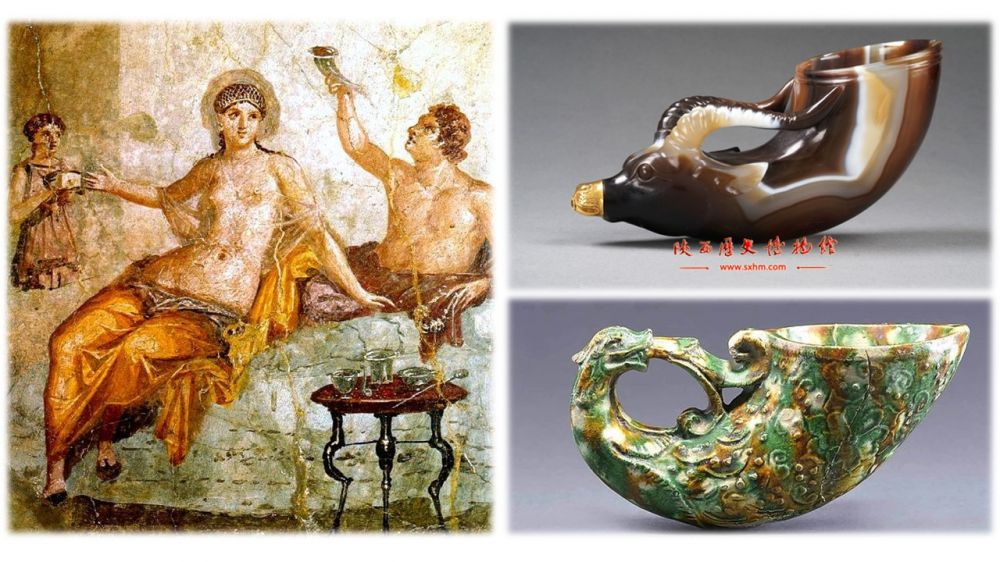 来通杯,起源于波斯,流传于古罗马、希腊,在南北朝时期经丝绸之路走进中原,并经过了本土化的再创造,它们是东西文明互鉴的一段佳话。下左:赫库兰尼姆古城的壁画中显示了来通杯的用法;右上:西安出土的兽首玛瑙杯,或来自西域,或为唐朝匠人仿制;右下:唐朝三彩来通杯。