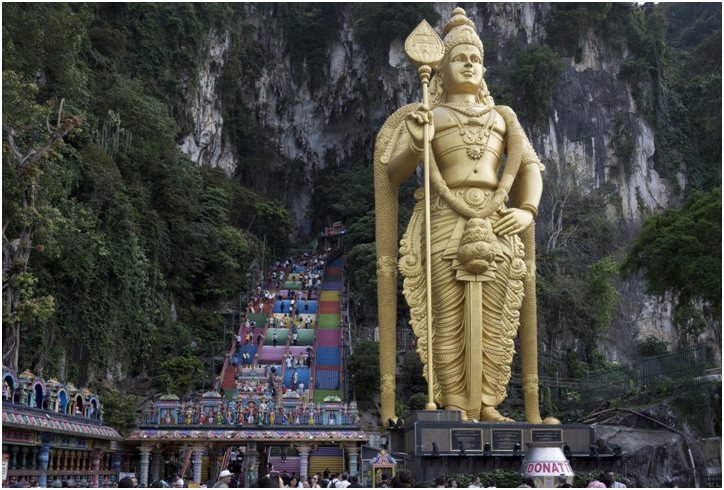 黑风洞(Batu Caves):左是入口上272级彩虹阶梯,右是金色的穆如干神巨像,背景是天然石灰岩洞