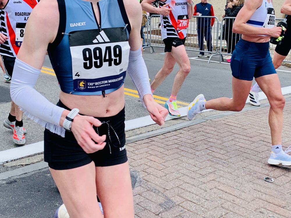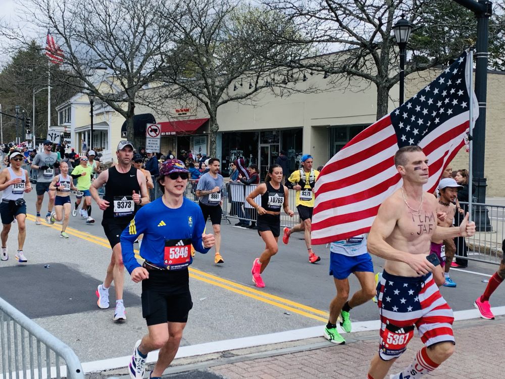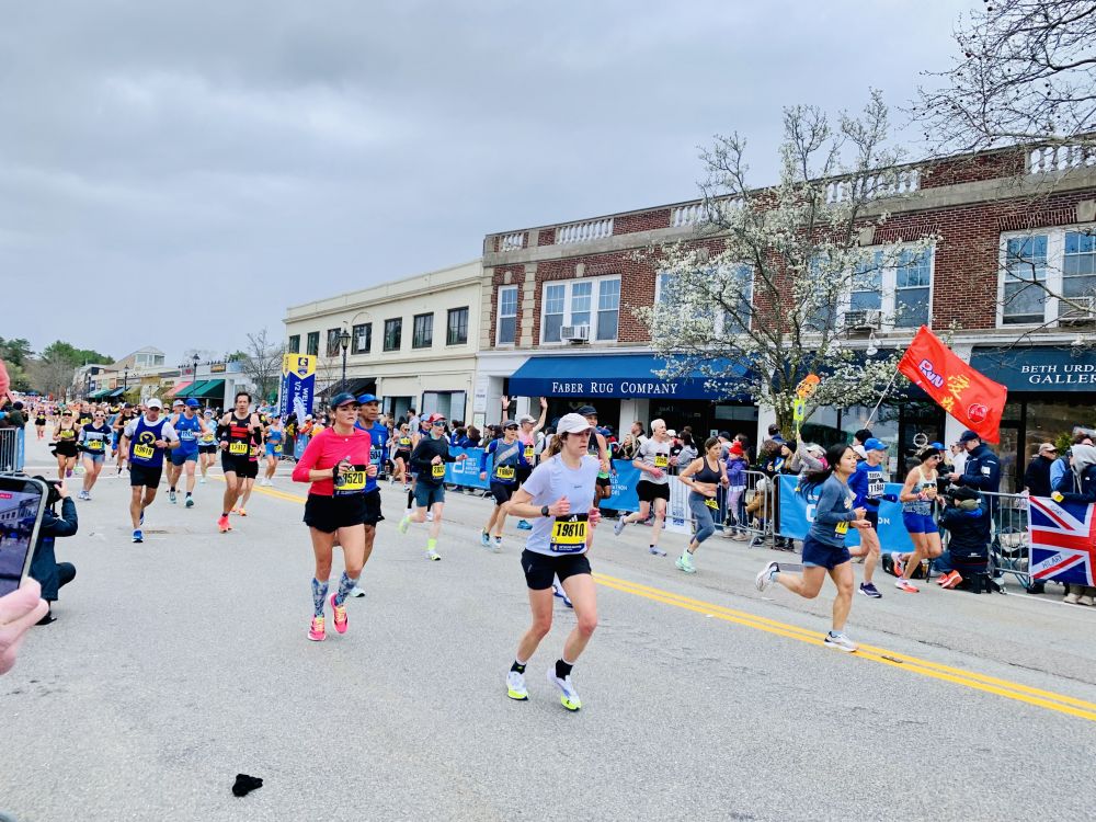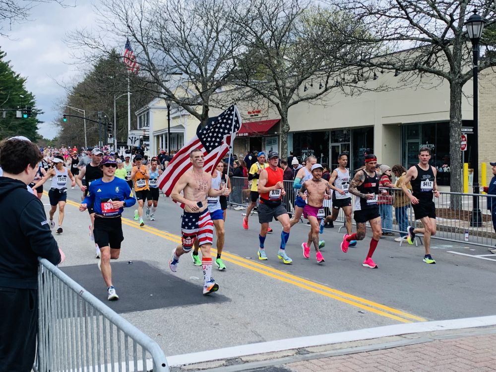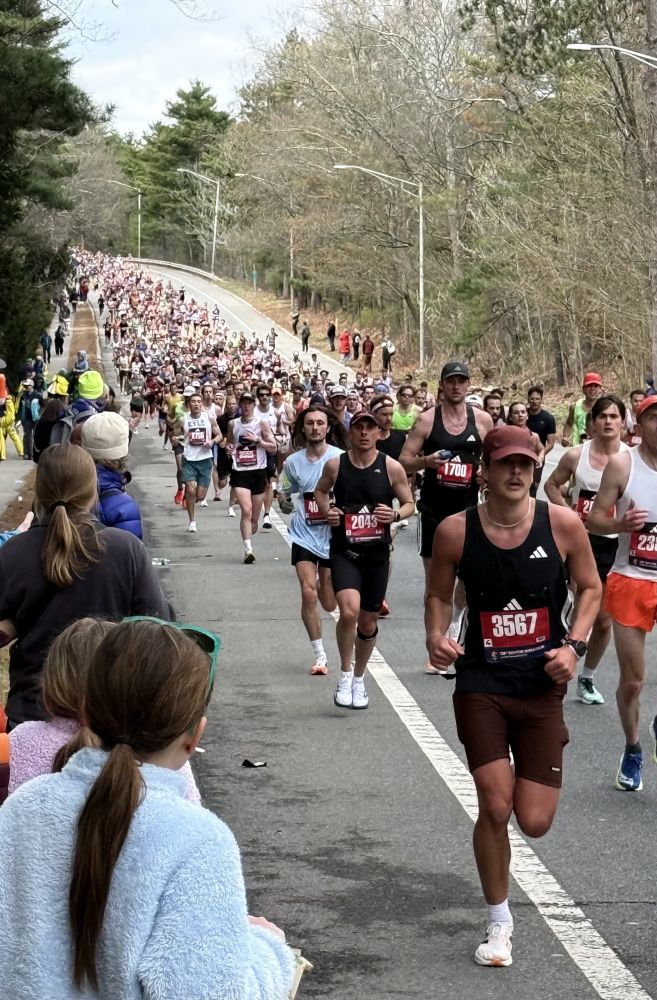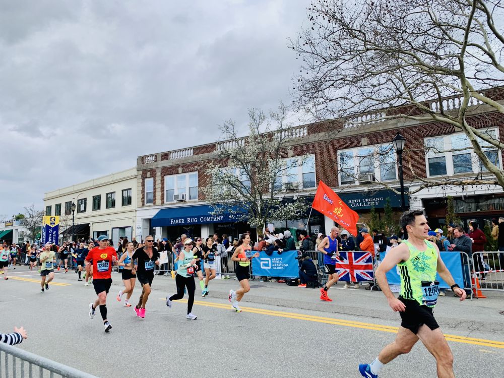 今年看波马有几点感受。第一是孩子多。尤其是小小孩。第二是亚裔跑者比较开心活跃。过去看到他们一直低头往前冲的多。今年有好几个人和鼓掌的观众互动。也许那是他们的家人或朋友。我们的朋友也在跑。他去外州读医学院。回来跑。可惜我没看到他。第三点,可能是天有点凉。搞怪的奇装异服不多。也许在后面。