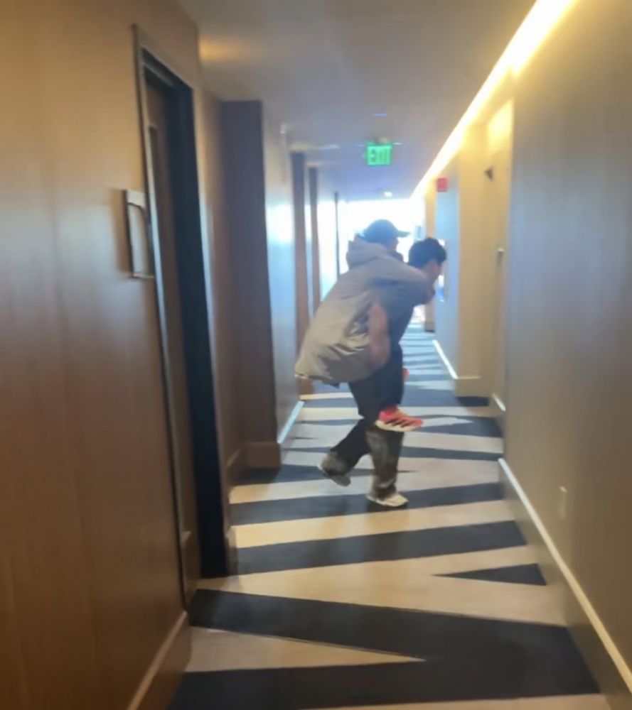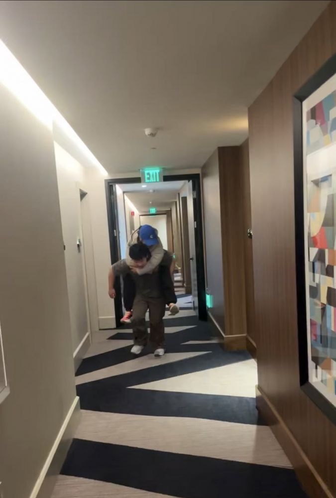 那个被我抱着背着的小男孩儿,在参赛的酒店长廊,第一次把老妈背起来完成了角色互换。