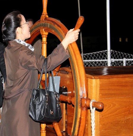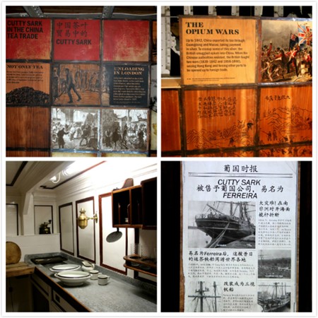 照片4-5:然而,这场晚会留给我最深刻印象的是参观卡蒂萨克。不仅是因为这艘有着138年历史的古老帆船上下有好几层,代表着帆船建造技术的顶峰,更是因为它当时在英国与中国商务交易中所起的作用。专门服务这个晚会的卡蒂萨克讲解员说卡蒂萨克帆船在那个年代主要用来从中国运回茶叶。