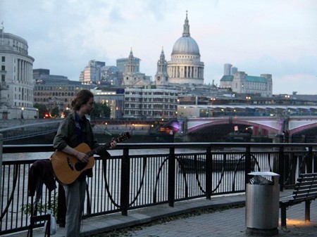 照片7:从我们下榻的Strand Palace Hotel,跨越Waterloo Bridge,沿着泰晤士河岸漫步到OXO塔的途中见到的一位街头音乐家正在弹奏英国传统民谣Scarborough Fair,那优美熟悉的旋律令我们驻足。交谈中得知,这位年轻人白天有正式工作,下班后在大街上用吉他弹奏乐曲是他的爱好,对音乐的热爱。街头音乐家所站的河对岸一个圆顶建筑是著名的圣保罗大教堂。