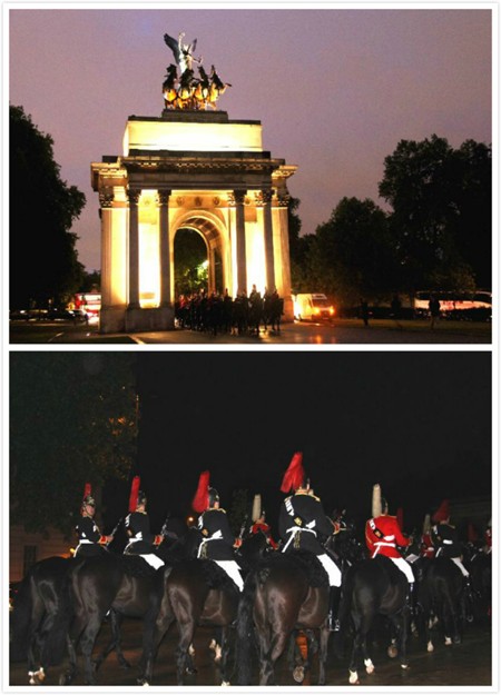 照片17:我们幸运地看到女王卫队的卫兵们下岗,骑马穿过Wellington Arch,走向海德公园。