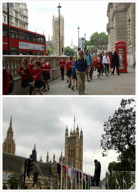 照片22:热闹非凡的国会大厦街(Parliament Street)以及国会大厦广场(Parliament Square,那座有点驼背胖老人的雕像是英国近代史上最伟大的总理丘吉尔)。