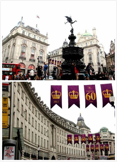照片24:热闹的Piccadilly Circus以及挂着彩旗的Regent Street。今年是英国女王伊丽莎白加冕60周年。