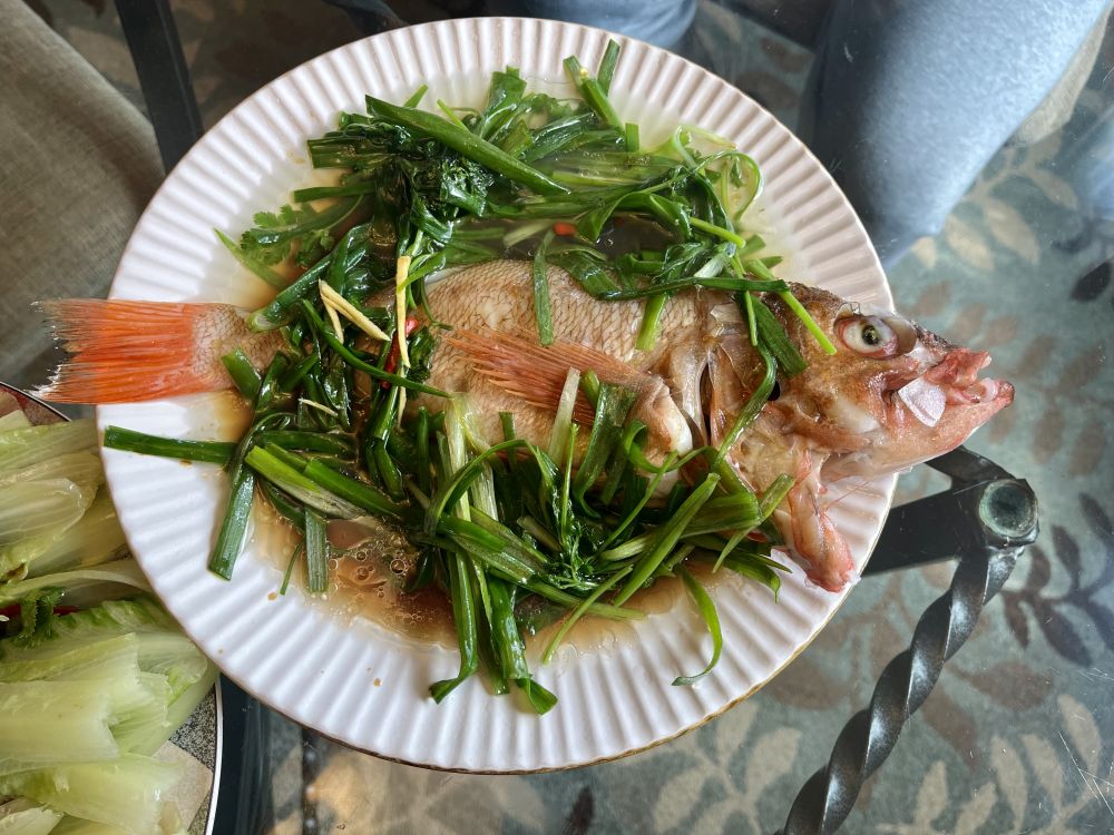 午餐:一盘青菜,一盘清蒸鱼(港口买的石板鱼),鱼汤捞饭,百吃不厌。