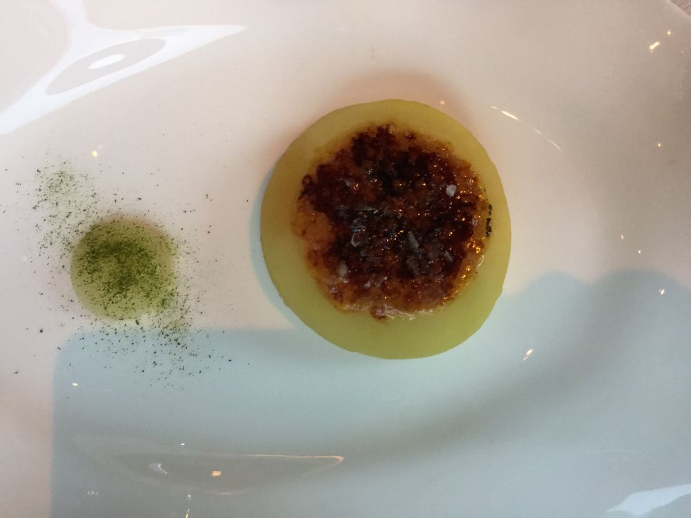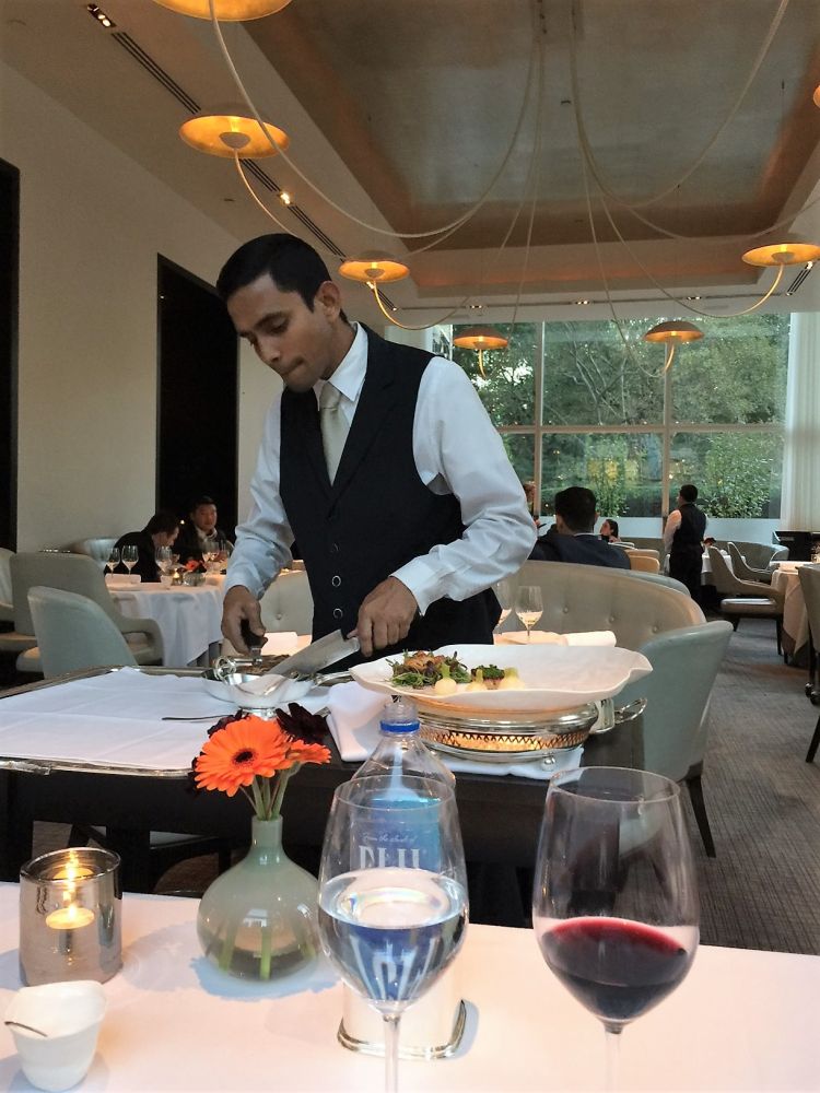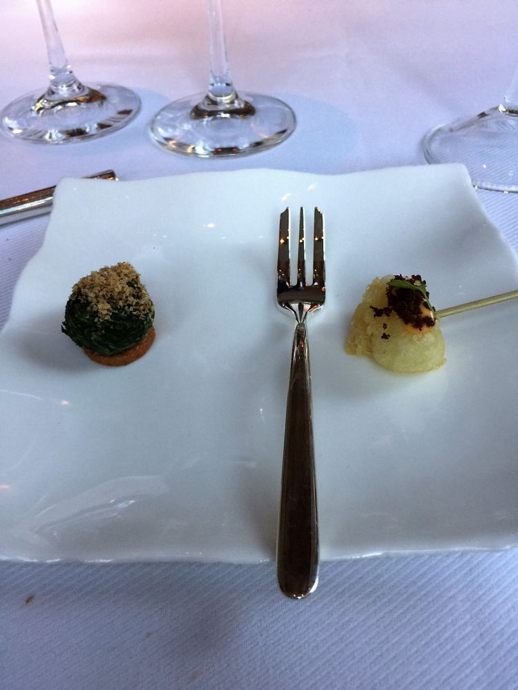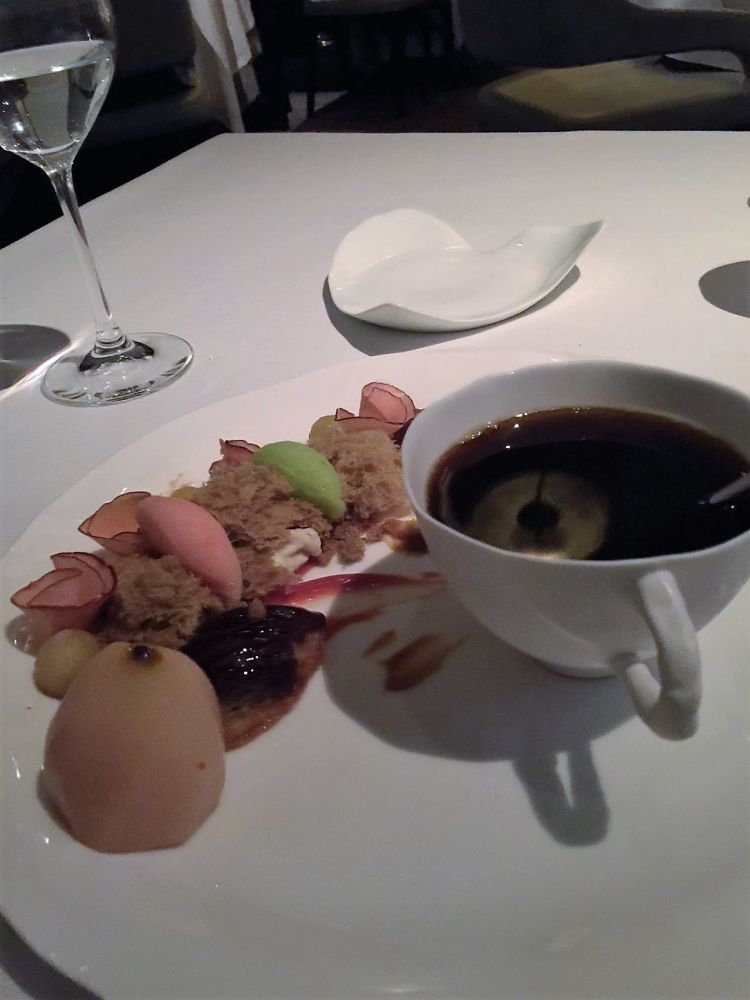 我们准点被安排进入餐厅。一个餐桌有四个侍应生,不停地在为你服务。菜谱上是分套餐的,一套是4道菜138刀,另一套是7道菜218刀。水酒饮料另加钱。在这几道之间,还有一些精致的小样品。每道菜上来侍应生都絮絮叨叨的介绍成分和制作方法。