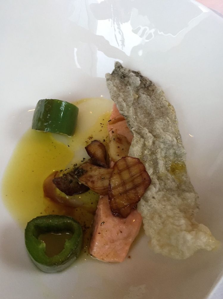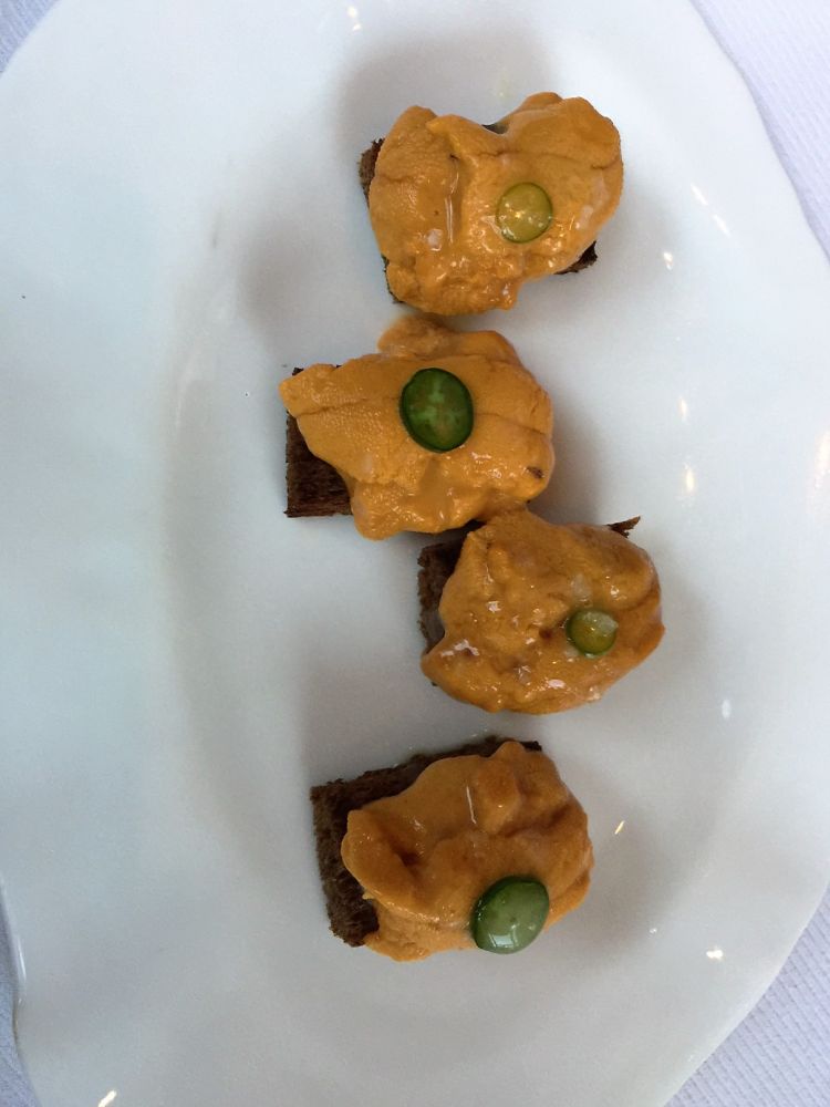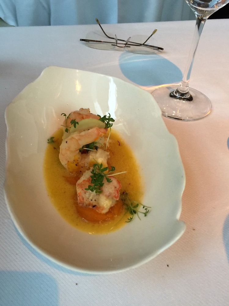 我们的头檯点了海胆和鹅肝,二道是三文鱼和虾,主菜是鲈鱼和鸭子。甜点是巧克力和热带水果。每道菜都很精美,味道真的是令人忘怀,最大的缺点是价钱不菲。