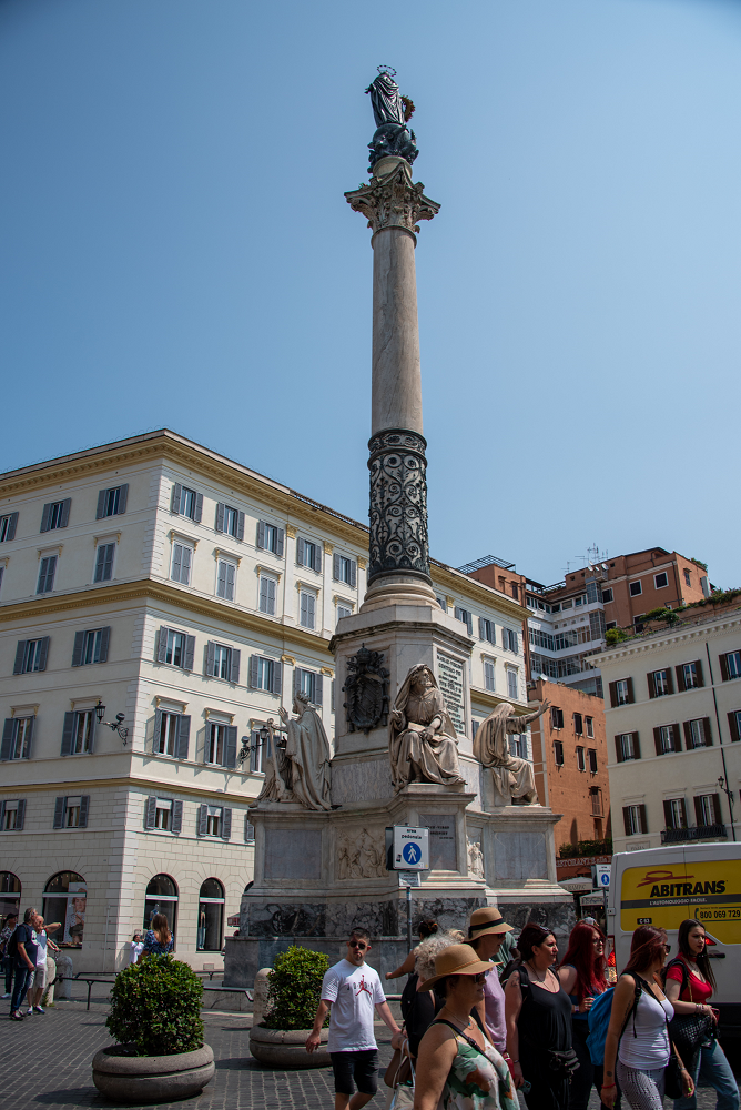 西班牙广场是《罗马假日》中男主角设计男、女主角假装“重逢”的场地。在西班牙广场附近,大家流连忘返,逗留时间超出了导游计划,离开时还差点走散一个家属(离开导游太远,超出无线语音系统的服务范围)。西班牙广场非常靠近有名的景点,除了山上天主圣三教堂,附近还有破船喷泉,圣母无染原罪柱以及Obelisk方尖碑。