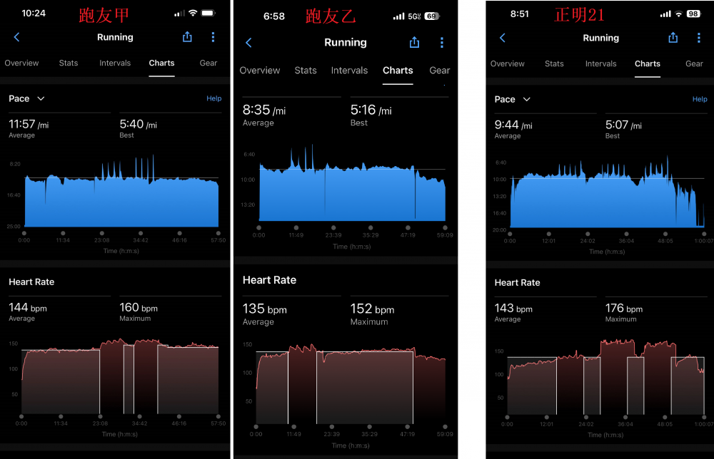 2天过后,一切正常,但跑步教练叫我暂时不要跑步,因为之前我跑步的心率曲线和其他人不太一样,虽然跑步多年,但心脏的肌肉特性和跑步新手一样较弱。参见下图,许多跑友(例如跑友甲和跑友乙)心率随着速度有一个相对线性的正比起伏,在加速跑(stride,即每过1分钟进行15秒钟快速冲刺跑,4-5次为一组)时,别人能跑出类似“狗牙”的状态,即速度上去时、心率跟着上去,速度下来时、心率也立即下来。我的第一组心率常常上不去,像是心脏反应较慢,后面2组的心率很快上去后不能随速度立即下来。教练建议我应该找心脏科医生,做一下长时间的心电图(连续24小时、或48小时),看心脏有没有问题再决定能不能跑步,若不能跑步就需要改作其它运动。