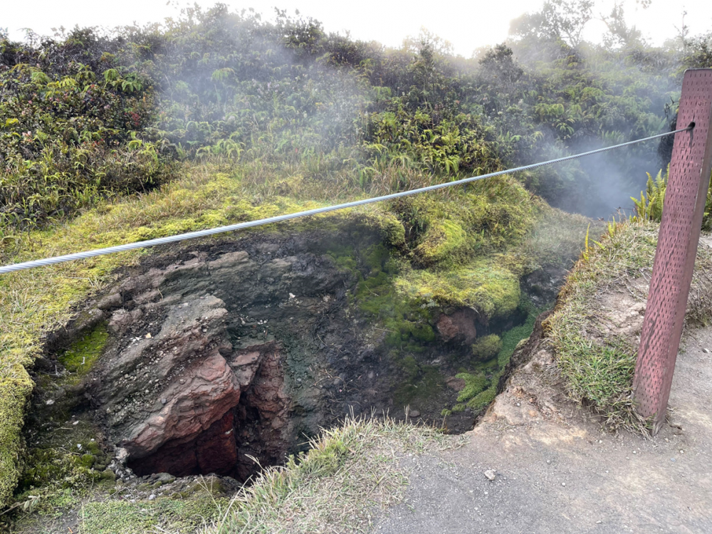 从游客中心出来,我们开车到景点(2)Steam Vents,那里到处雾气腾腾。远处能看到基拉韦厄火山喷发的烟雾,只是看不到火山喷发的火焰。在景点(2)能欣赏基拉韦厄火山(Kīlauea caldera) 的全景。
