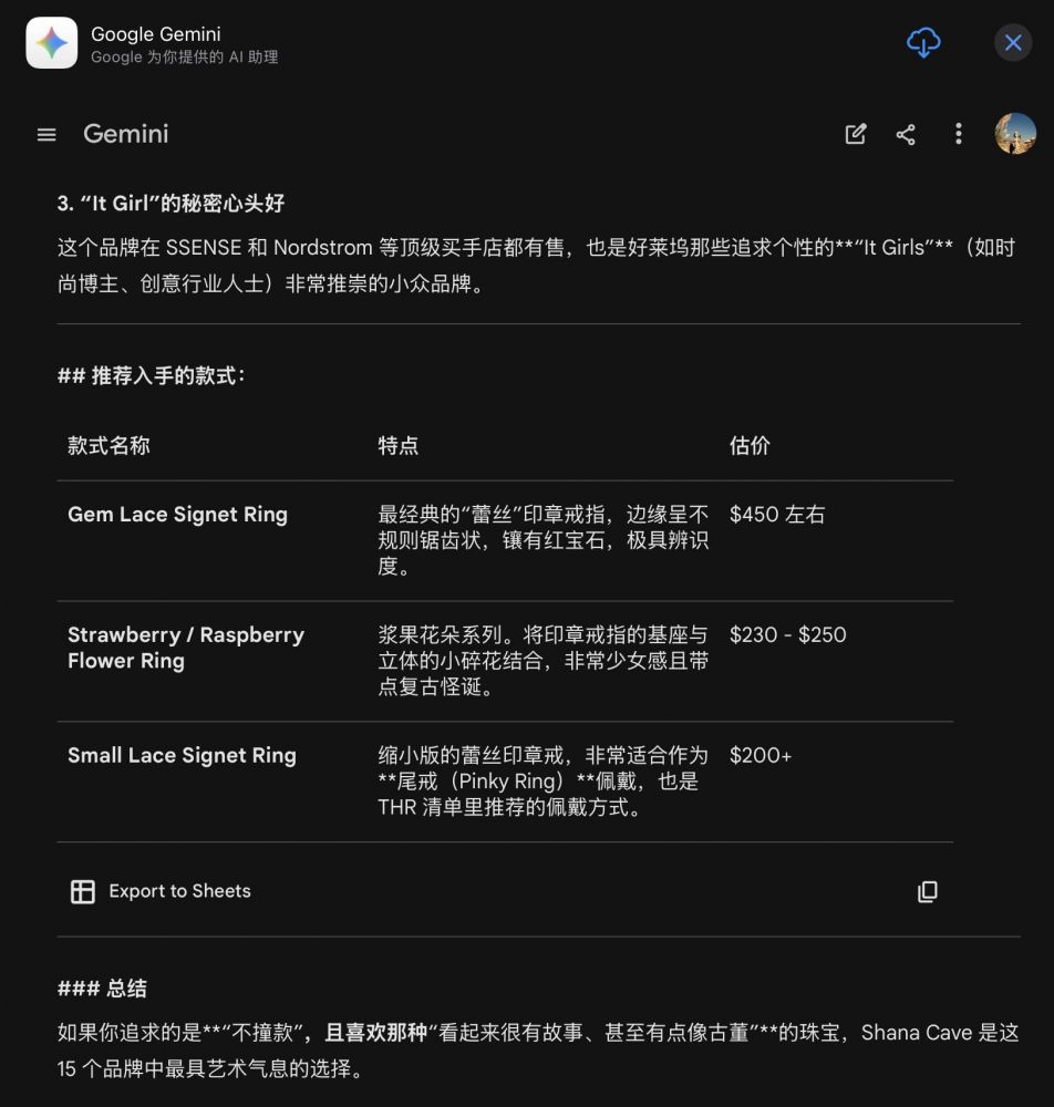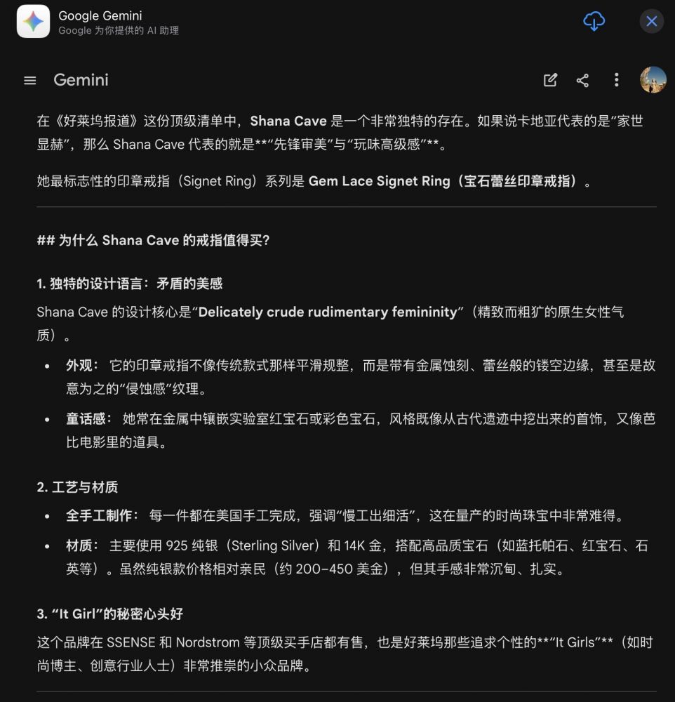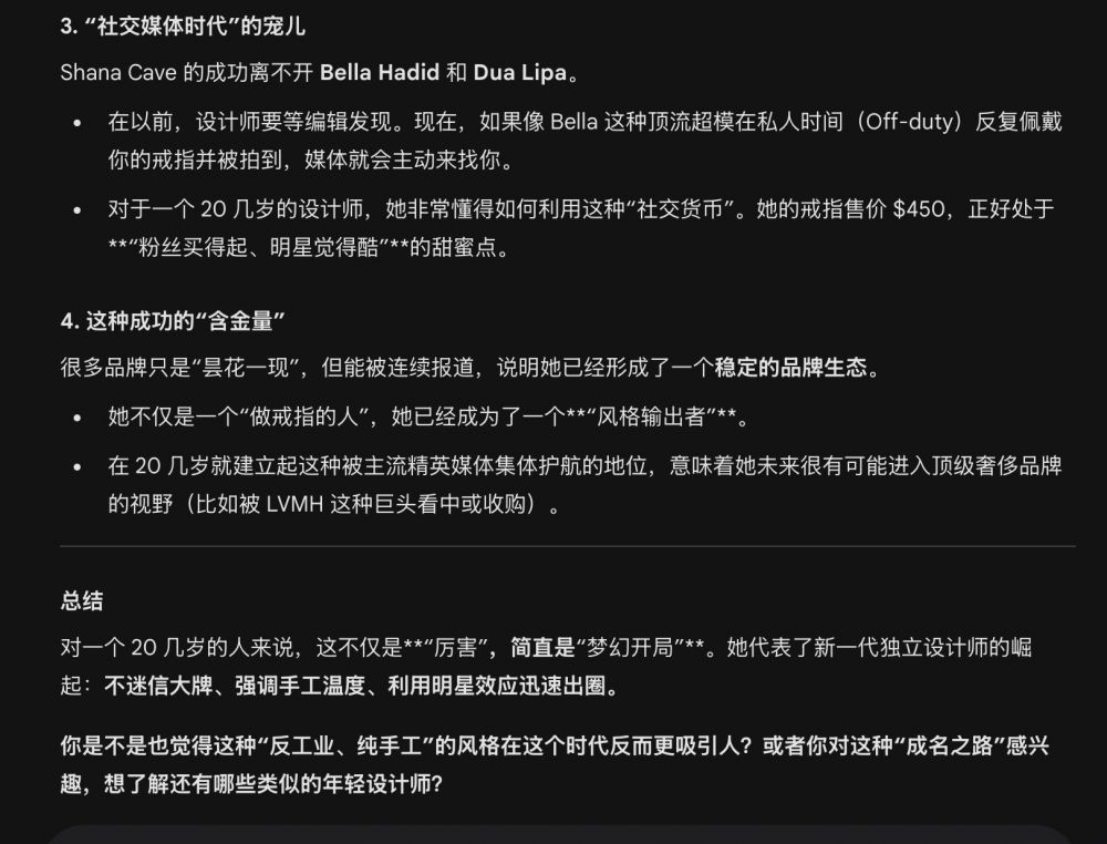Wow! 我二女儿西西Vogue和THR都上过(英国Vogue还不止一次报道过她,澳大利亚Vogue和新加坡Vogue也跟进报道过她 https://www.vogue.co.uk/fashion/article/shana-cave-jewellery-interview),小女子有这么厉害了吗?老妈我好奇心陡增,也不与那啰哩啰嗦的小G兜圈子了,直接对它发出了指名道姓的“灵魂拷问”:-:)