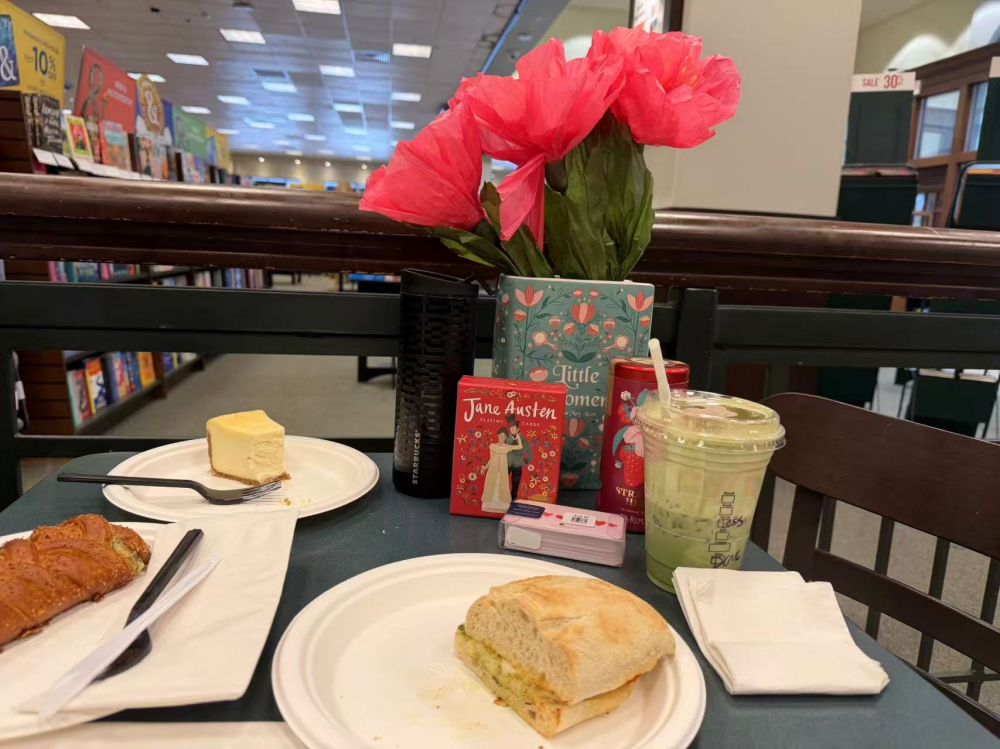 这周请假太多。不想取消太多客户的约见。今天我只给了自己二个小时的午休 break。这几年,我们都是去镇上Barnes & Noble。我特别喜欢那里的环境,视野开阔,坐在星巴克里,吃着简单的三明治,还有甜点。和先生聊聊天,还打打牌,输输赢赢,开怀大笑。