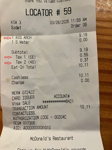 吃着大汉堡,瞥了一眼账单子,大汉堡$9.19,外加一杯水,总账$10.11,几乎多了一块钱。再仔细看,有两个税,Tax 1和Tax 2。闹不明白是怎么回事,就问服务员。服务员也搞不机密,把经理叫来。经理很认真地对我说,第一个税是联邦政府税,第二个税是川普税。我瞪着经理说,Are you kidding? 经理耸了耸肩膀,阴阳怪气地说,Go ask Trump。