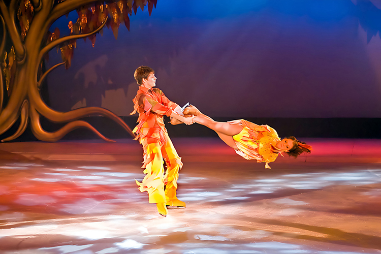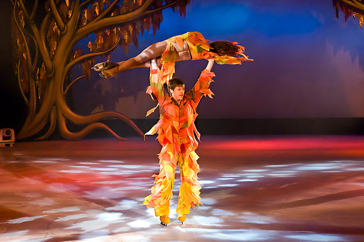 这个冰上秀用花滑舞蹈依次展现春、夏、秋、冬四个季节的神韵。剧目的编剧,服装,灯光,以及音乐都安排得美轮美奂。拍下来的剧照被我当作电脑屏保,滚动播放,实属美的享受,不分享出来于心不忍。