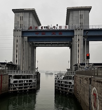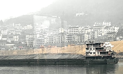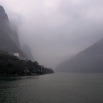 我们是坐车先看三峡大坝,然后坐船穿越西陵峡回到宜昌。其间过船闸。 入三峡,江不再只是江。两岸奇峰对峙,江山壮丽。 那天阴天多云,到处烟云茫茫,把景色晕染开来,倒也有另一番情趣。 岸边可以看到居民白色的小楼连成片。