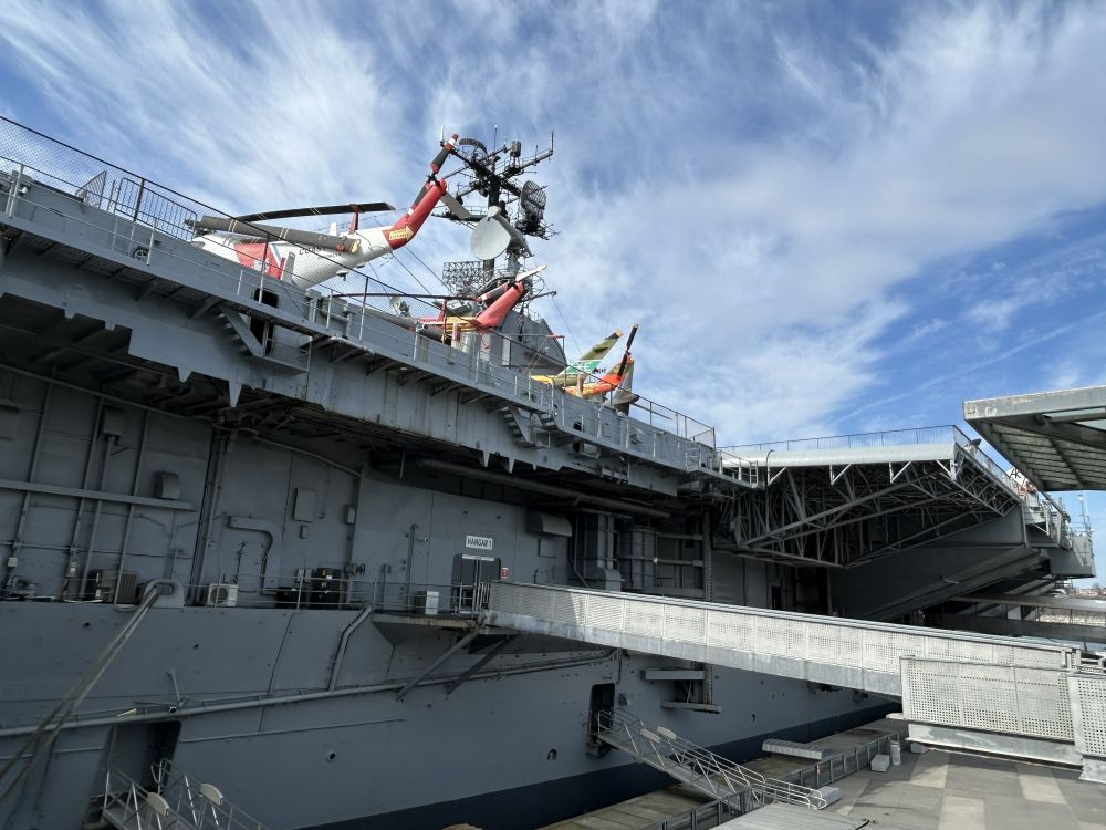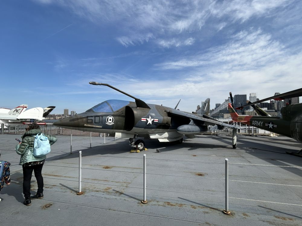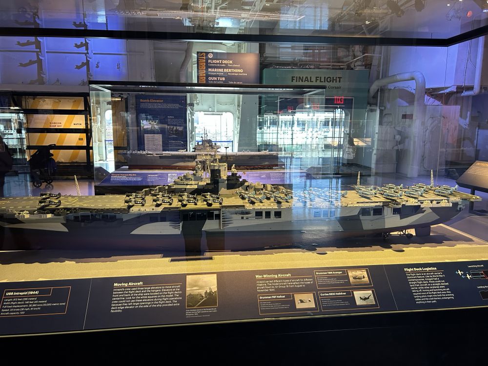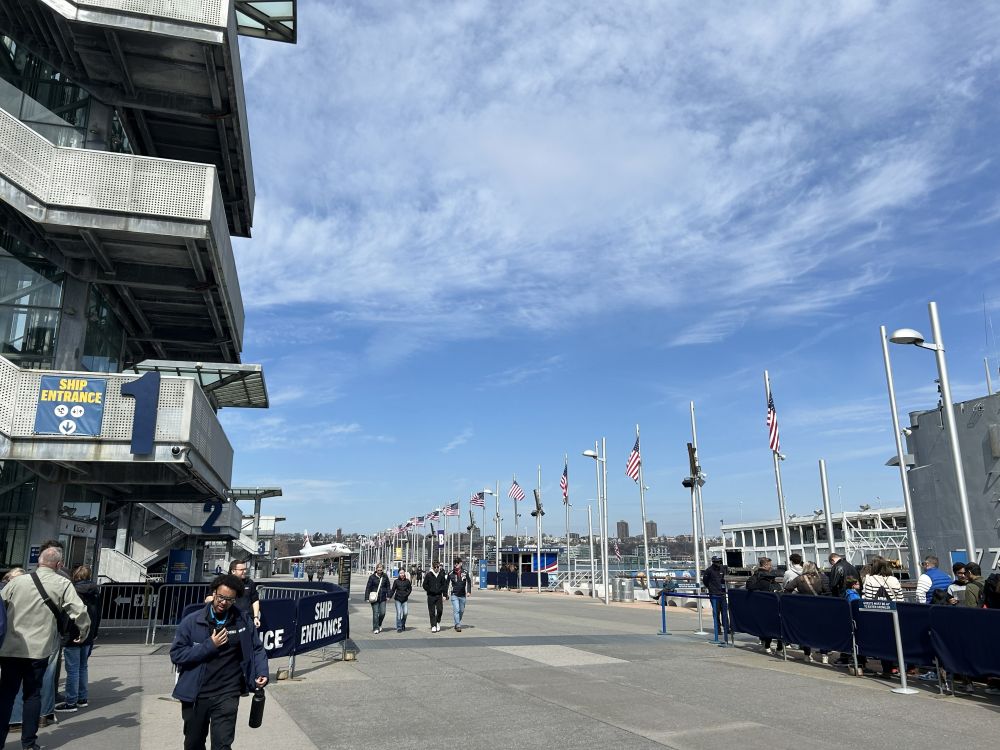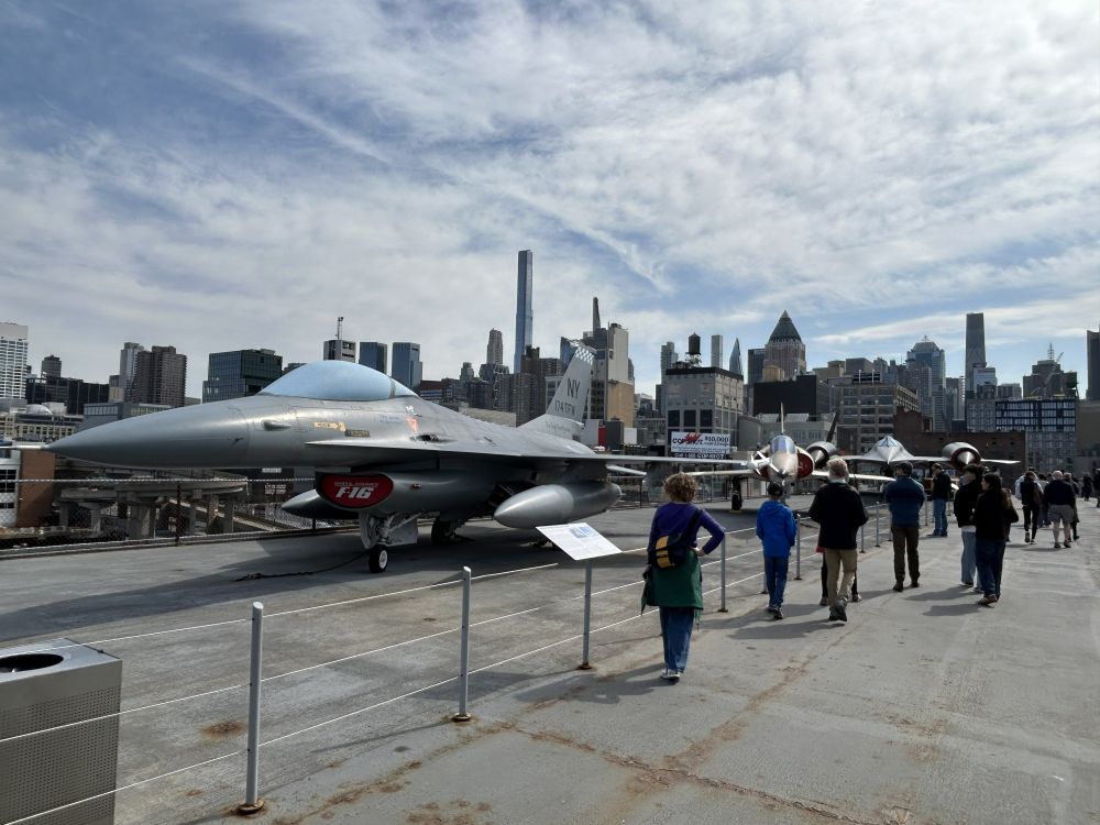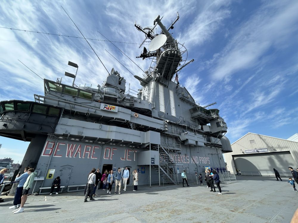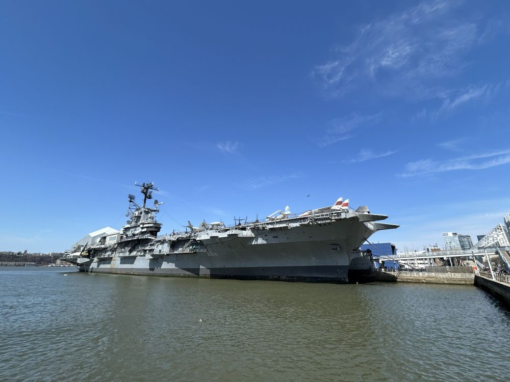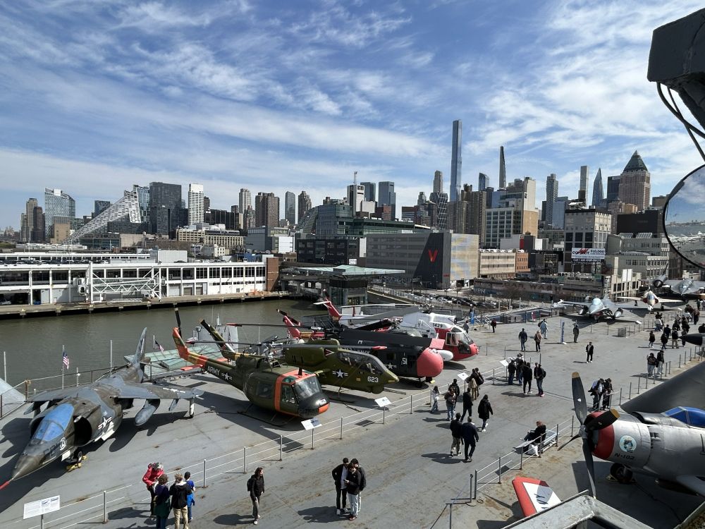 选在曼哈顿中城住宿,出行比较方便,向上走不远可到中央公园及其周边诸多博物馆,时代广场等地标性所在更是近在咫尺,百老汇大街和第五大道最热闹的地段也在中城。位于哈德逊河畔的无畏号航母博物馆虽然地处中城,但稍微偏西了些。有一次从附近的码头坐邮轮游巴哈马群岛时,曾经在船上看到过无畏号甲板上成排展示的各种飞机,但一直没有进去参观过。这次,一家人出游有机会登上航母一探究竟。