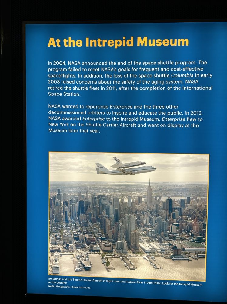 企业号航天飞机并没有像其他航天飞机那样真正服役执行太空任务,因为它是一架原型测试机,从未进入太空轨道。2012年,企业号被NASA赠予无畏号博物馆,用于激励和教育大众的目的。企业号航天飞机的加入,凸显了无畏号在战争,和平和太空探索三重历史中的角色。下图是企业号为加入无畏号博物馆,作最后一次飞行飞临纽约上空时的情景。