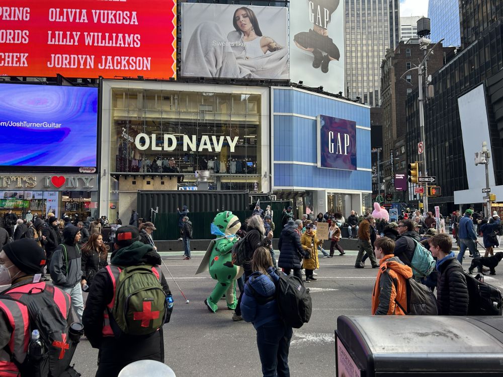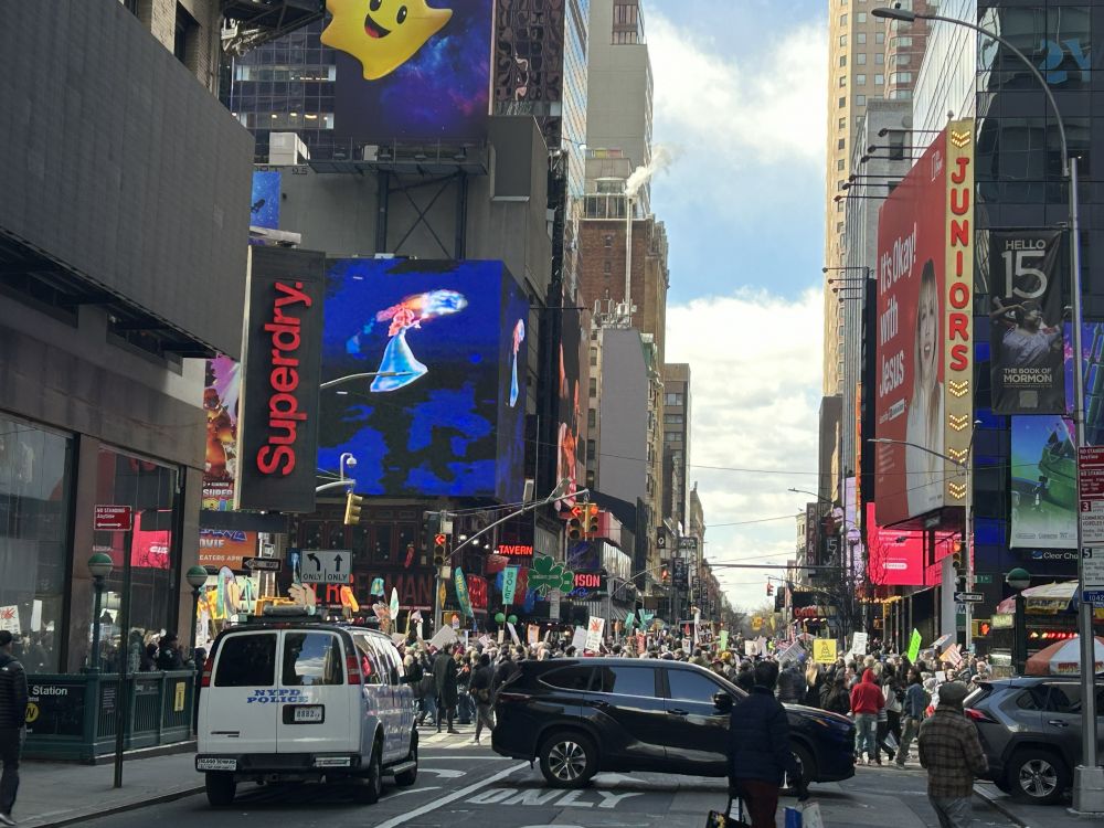 为了尽快赶到酒店,我们只是跟游行队伍逆向而行,没有停下脚步仔细看。后来看新闻报道,说是当天这场席卷全国各大城市的示威游行有多达数百万人参与。纽约这场示威游行从曼哈顿中央公园南侧7大道集结,随后沿第7大道和百老汇一路南下。示威组织者通报参与纽约游行人数多达30万,媒体和NYPD通报的人数相对保守,但也有数万之众。