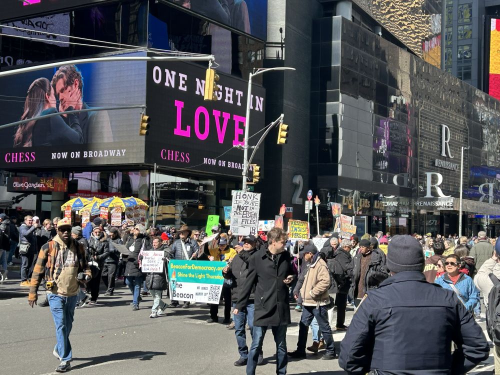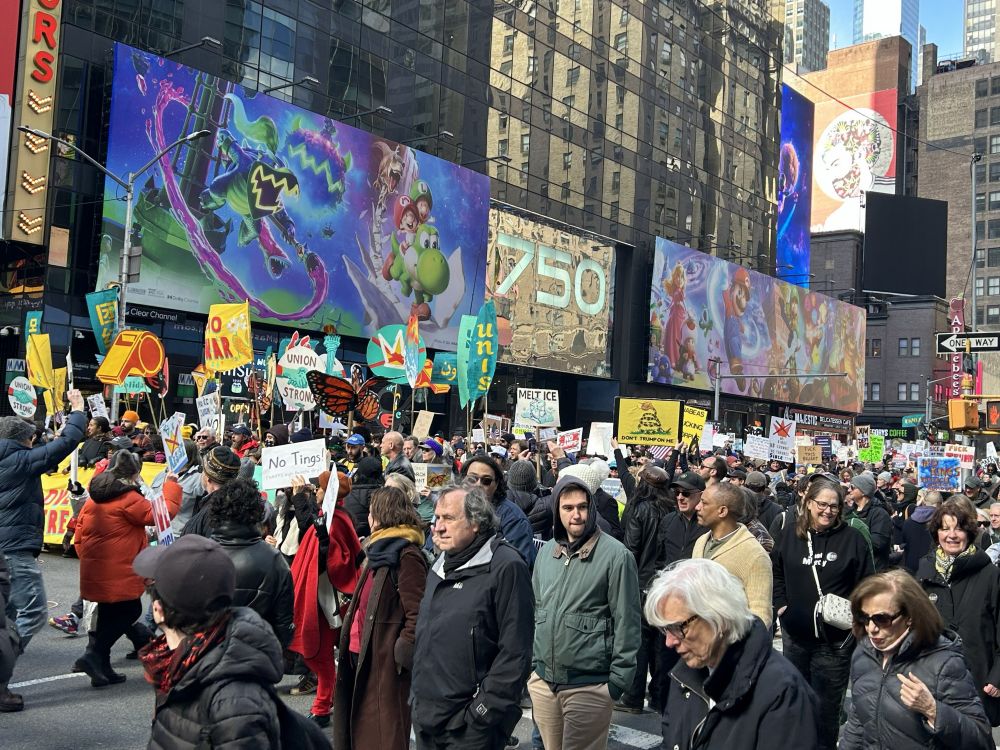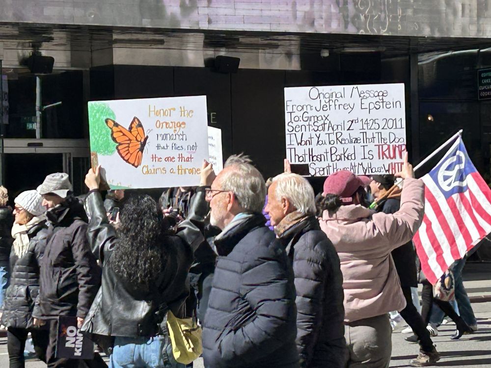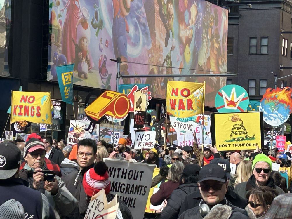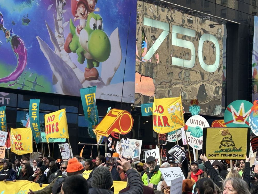 那天,车抵曼哈顿,刚出巴士站走在第7大道上,但见满街人潮汹涌,摩肩接踵,人声鼎沸。原来,我们赶上了当天正在举行的全国性“不要国王”(No Kings)大游行,抗议川普总统第二任期的举措与政策,包括伊朗战争,民主倒退,ICE执法行动等等。