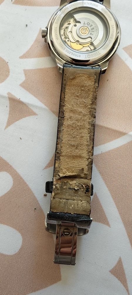 如今这块表的表带都已经老化成粉,表已经是废铁了。