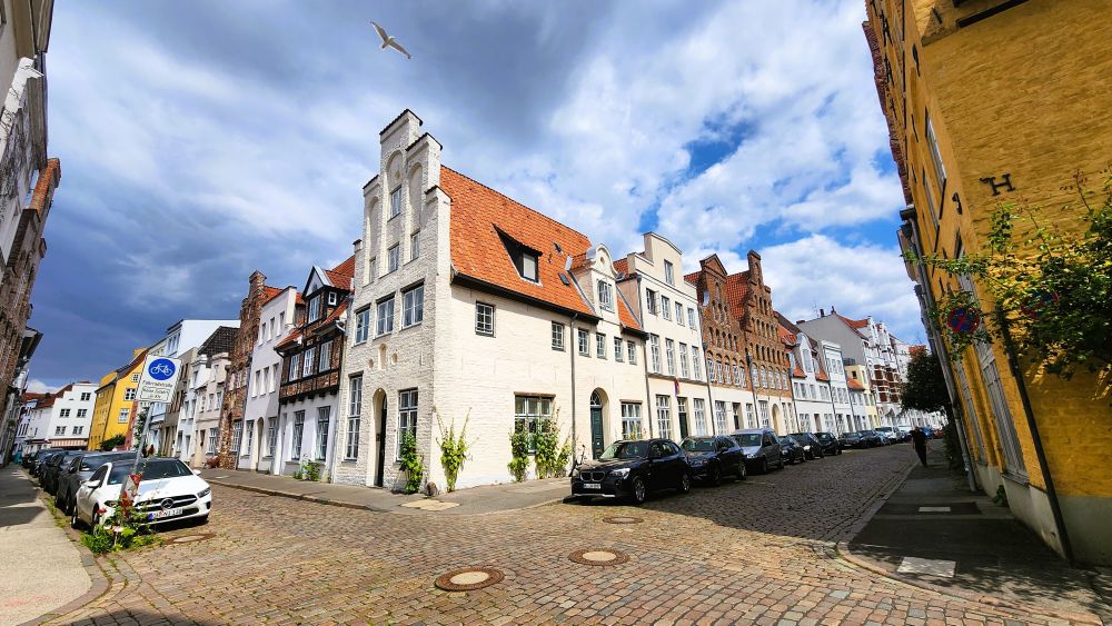 典型的 Lübeck 市民住宅。 建于 17–18 世纪,特点是:白色抹灰外墙, 对称窗户, 红瓦屋顶, 面向河岸, 前面是步道与树木。 它们是当时富裕市民、商人、船主的住宅。