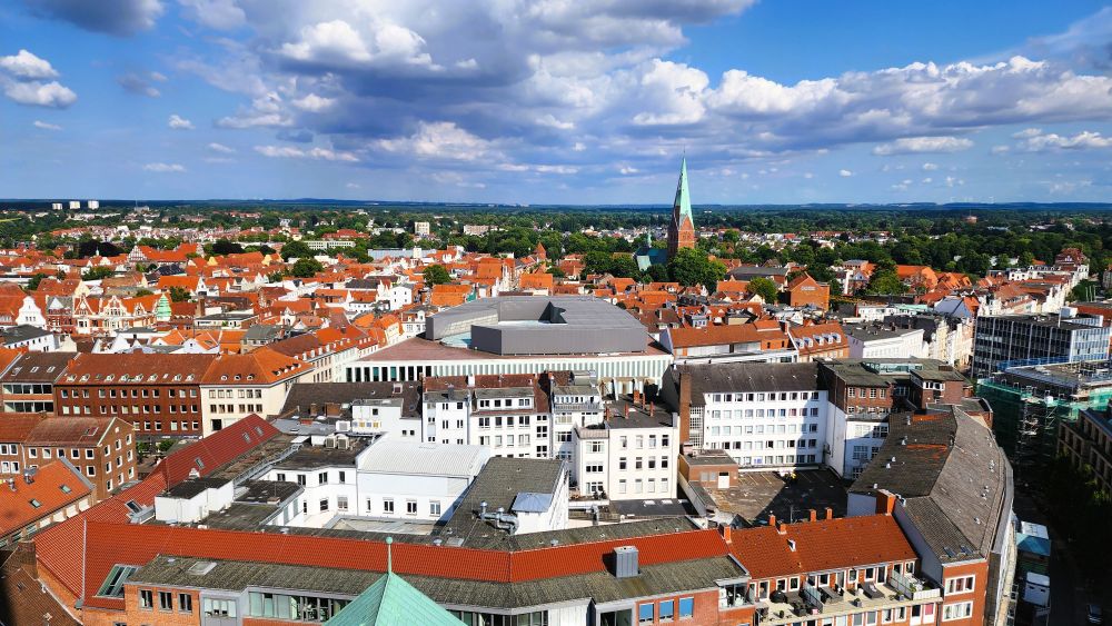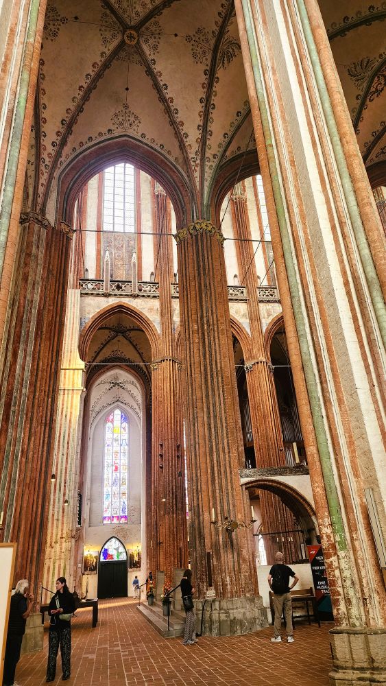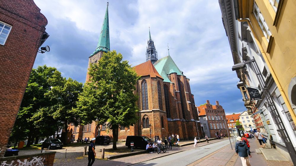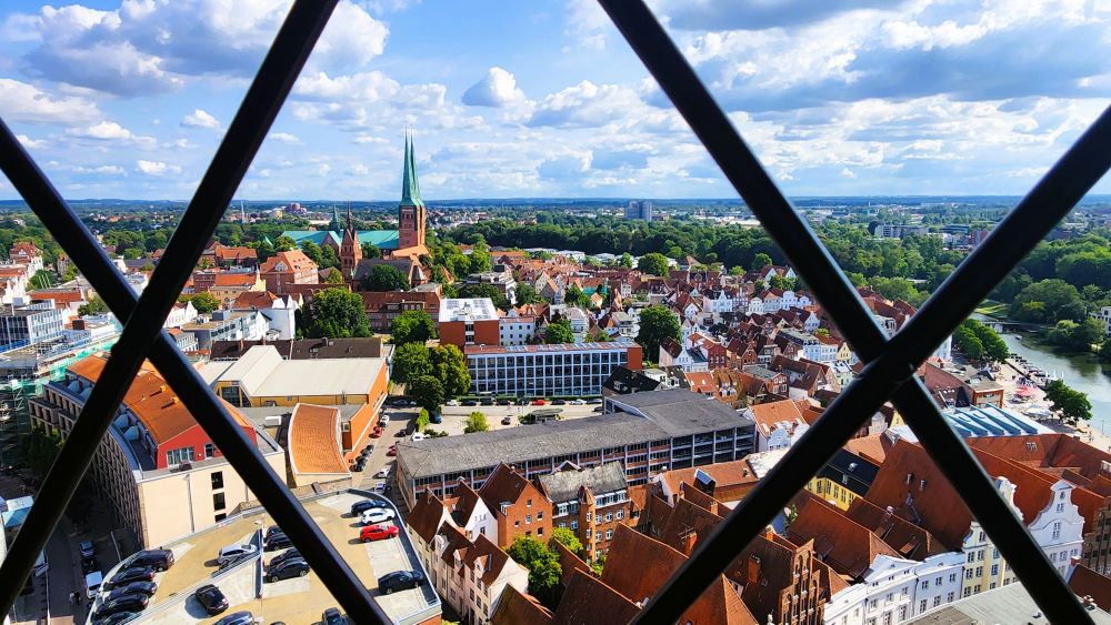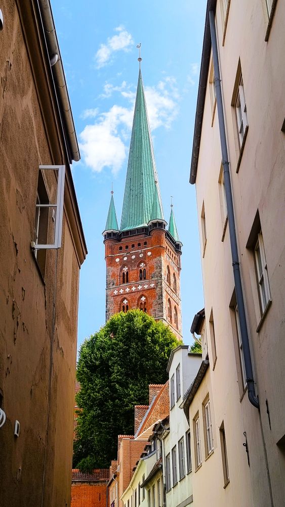 远处那根高高的尖塔是:St. Petri Kirche(圣彼得教堂)它是吕贝克老城最重要的教堂之。建于 12–13 世纪, 高约 108 米, 典型汉萨哥特式风格, 我们最后登顶俯瞰整个吕贝克。