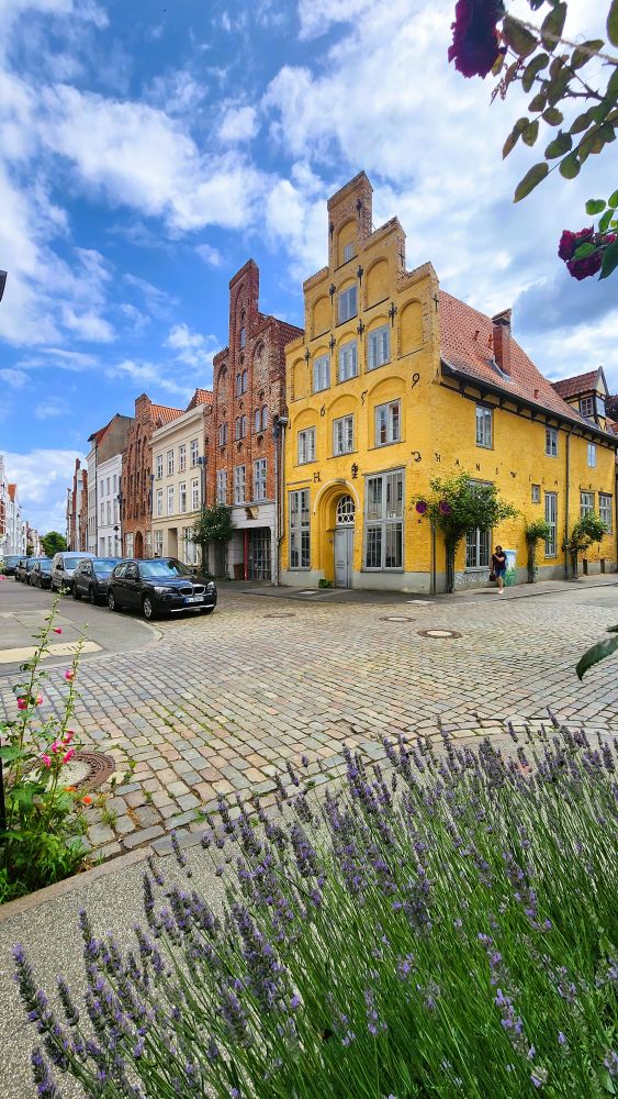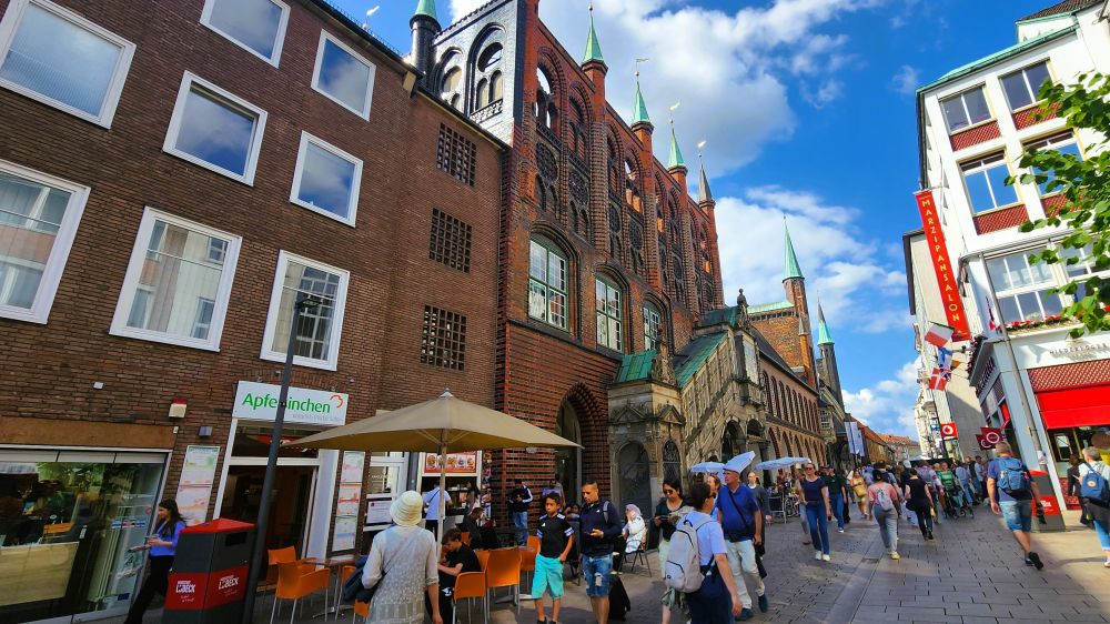 Lübeck 老城最典型的“市民权力建筑群”:中间吕贝克老城的市政—司法—行政建筑群的一部, 文艺复兴的庄重标志。 右侧巴洛克黄色建筑的柔和、左侧红砖建筑,汉萨同盟的市民住宅风格, 三墙并肩而立, 像一部城市的时间轴。