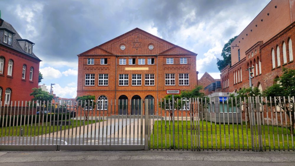 转过街角, 这座犹太会堂的历史非常沉重, 它建于 1880 年代,属于德国犹太社区在解放后兴盛时期的建筑。1938 年水晶之夜(Kristallnacht)被纳粹纵火, 吕贝克是德国最早遭受纳粹暴力的犹太社区之一。1994 年再次遭纵火(新纳粹袭击)震惊全德国,是战后德国最严重的反犹事件之一。2005 年又遭袭击, 因此旁边有警察岗亭。