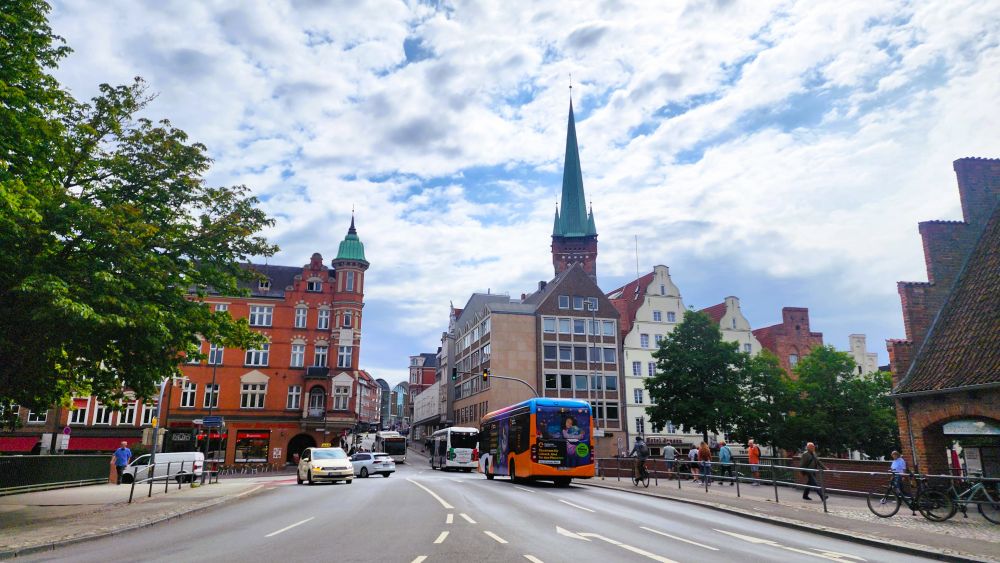 开始进城。 现代公交与古城景观交织是 吕贝克最经典、最具代表性的街景之一。