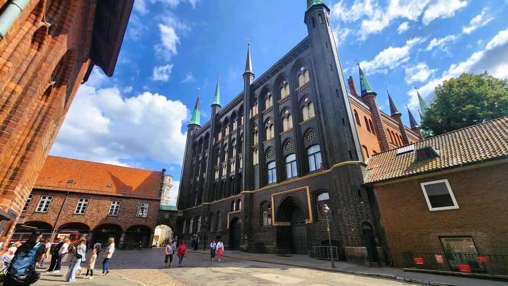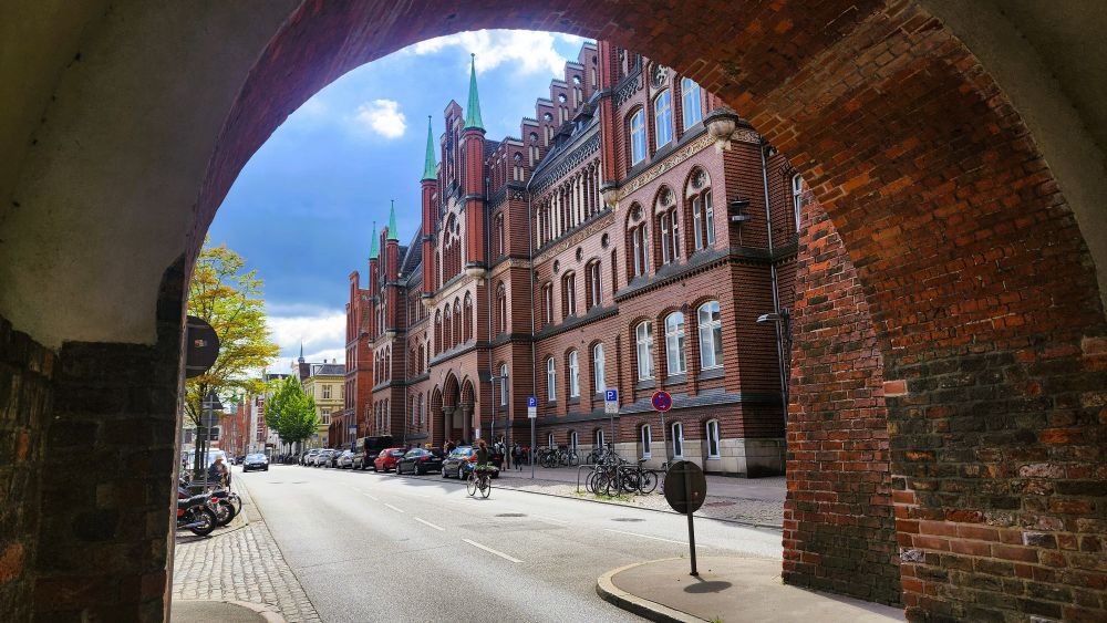 透过这道中世纪的城堡门的深拱,望向的是充满威严感的吕贝克地区法院。它建于 19 世纪末,采用了新哥特式风格,为了与吕贝克的中世纪底蕴相呼应。