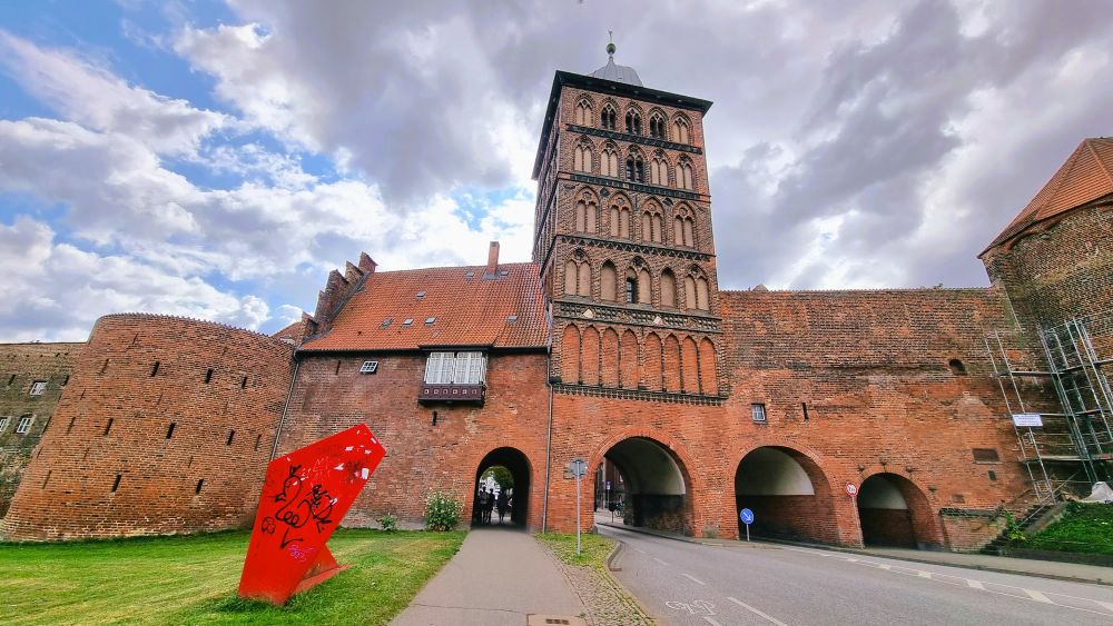现代艺术的撞击: 前景中那个鲜红色的不规则几何雕塑,是吕贝克城市中的现代艺术点缀。它与古老的红砖建筑形成了强烈的视觉对比。防御的纵深: 你可以看到现在有好几个门洞。最中间那个高大的是以前唯一的入口,两侧的小门洞是为了现代交通(行人、自行车)后来补开的。